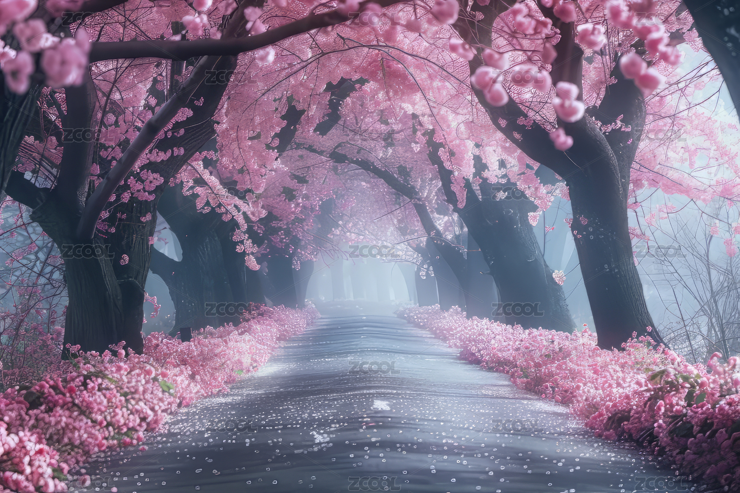 粉色樱花树盛开铺满道路