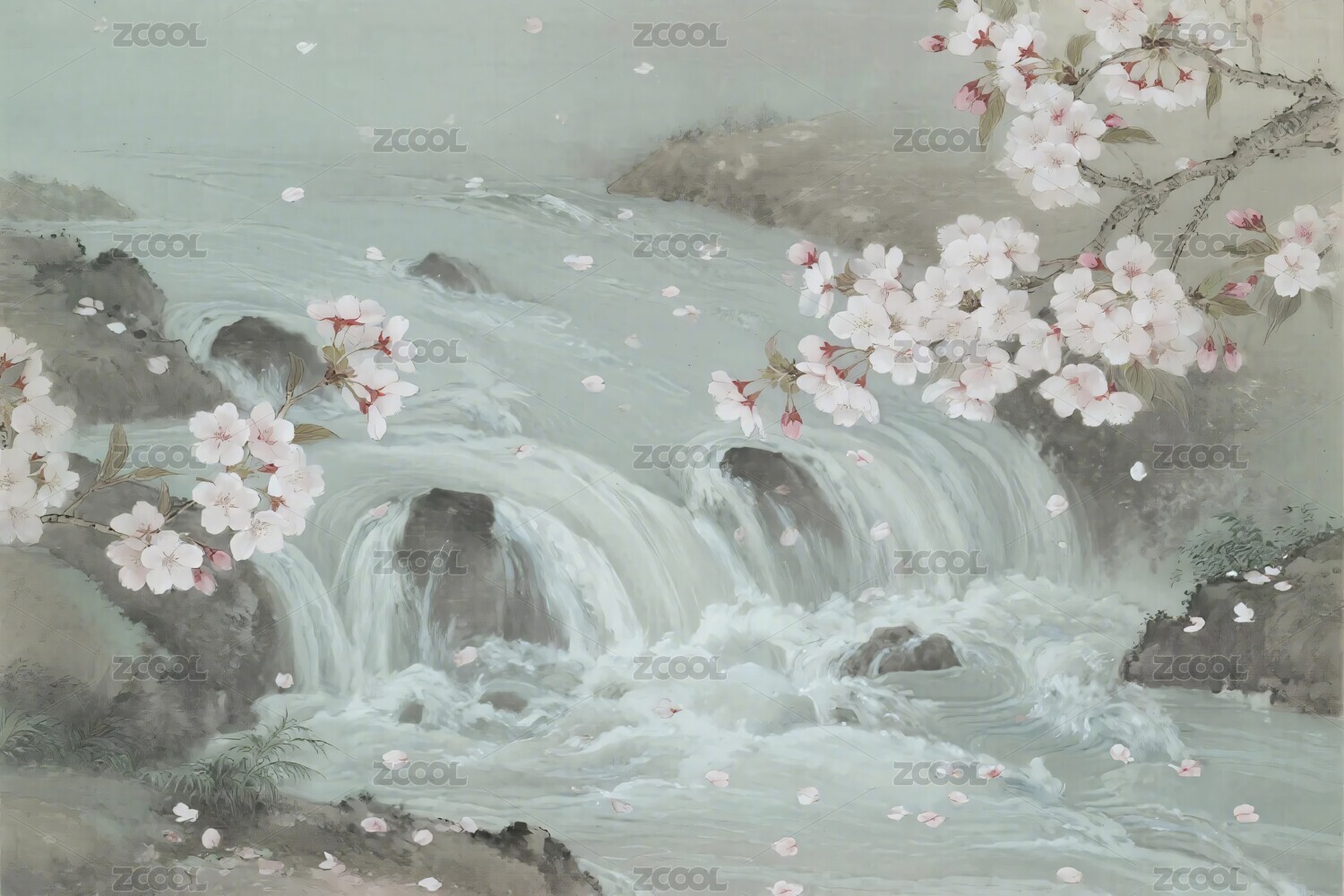 山水水墨樱花图