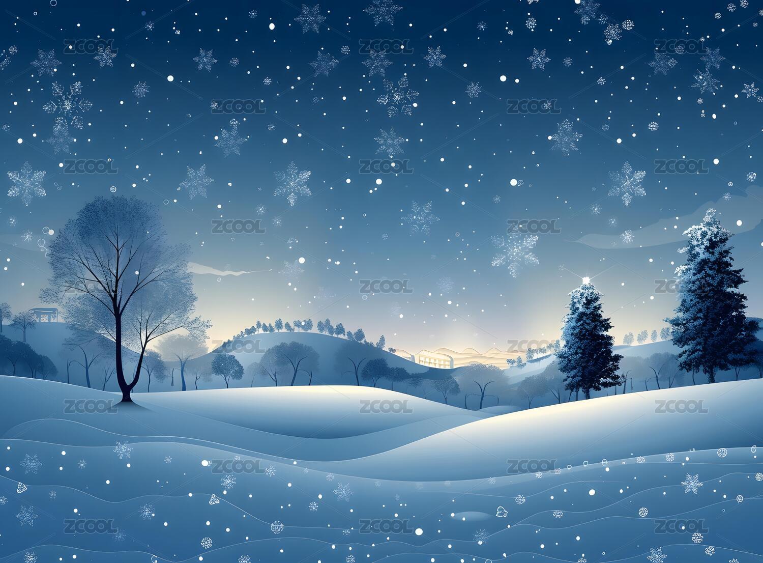 深蓝色,白色,雪花,夜空,灯光,树木,飘落,雪景,积雪,地面