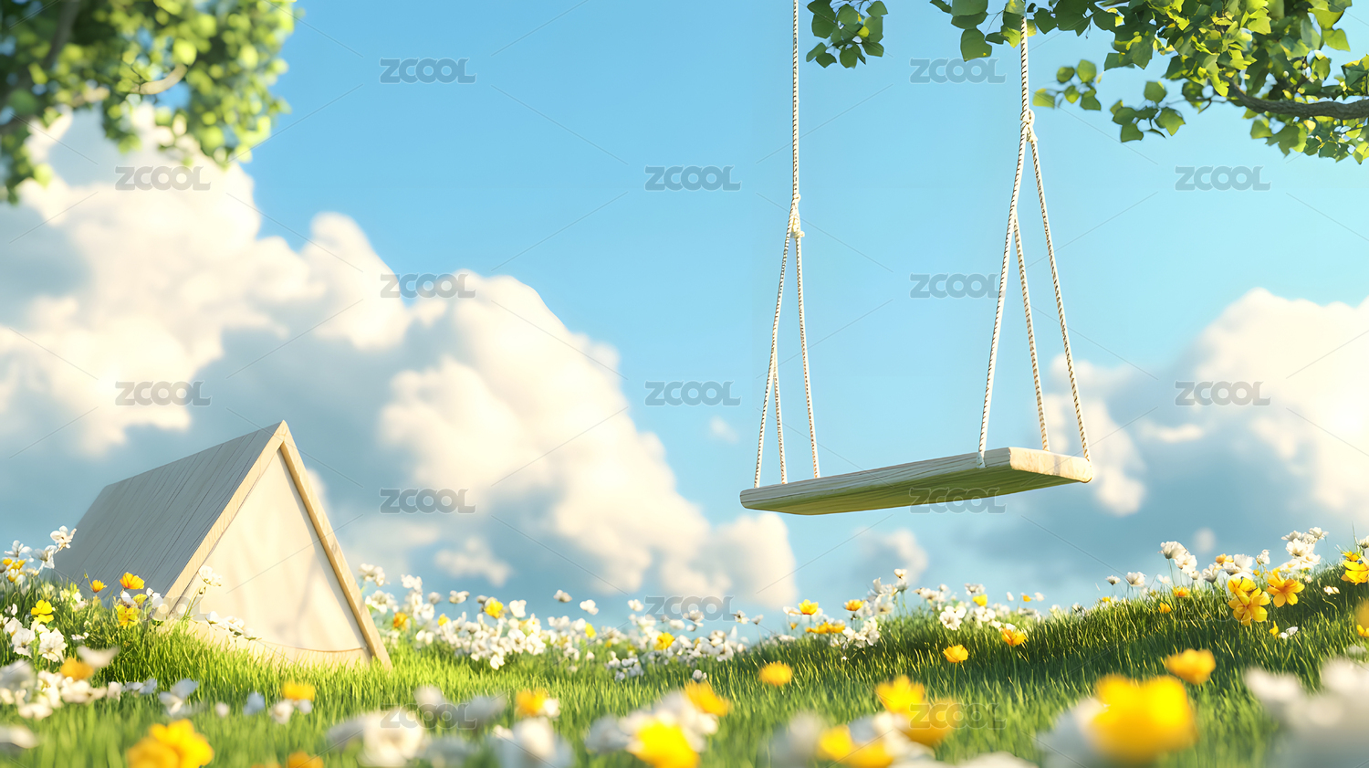 背景,绿色,树木,黄色,柔和,花朵,温暖,大树,秋千,草地