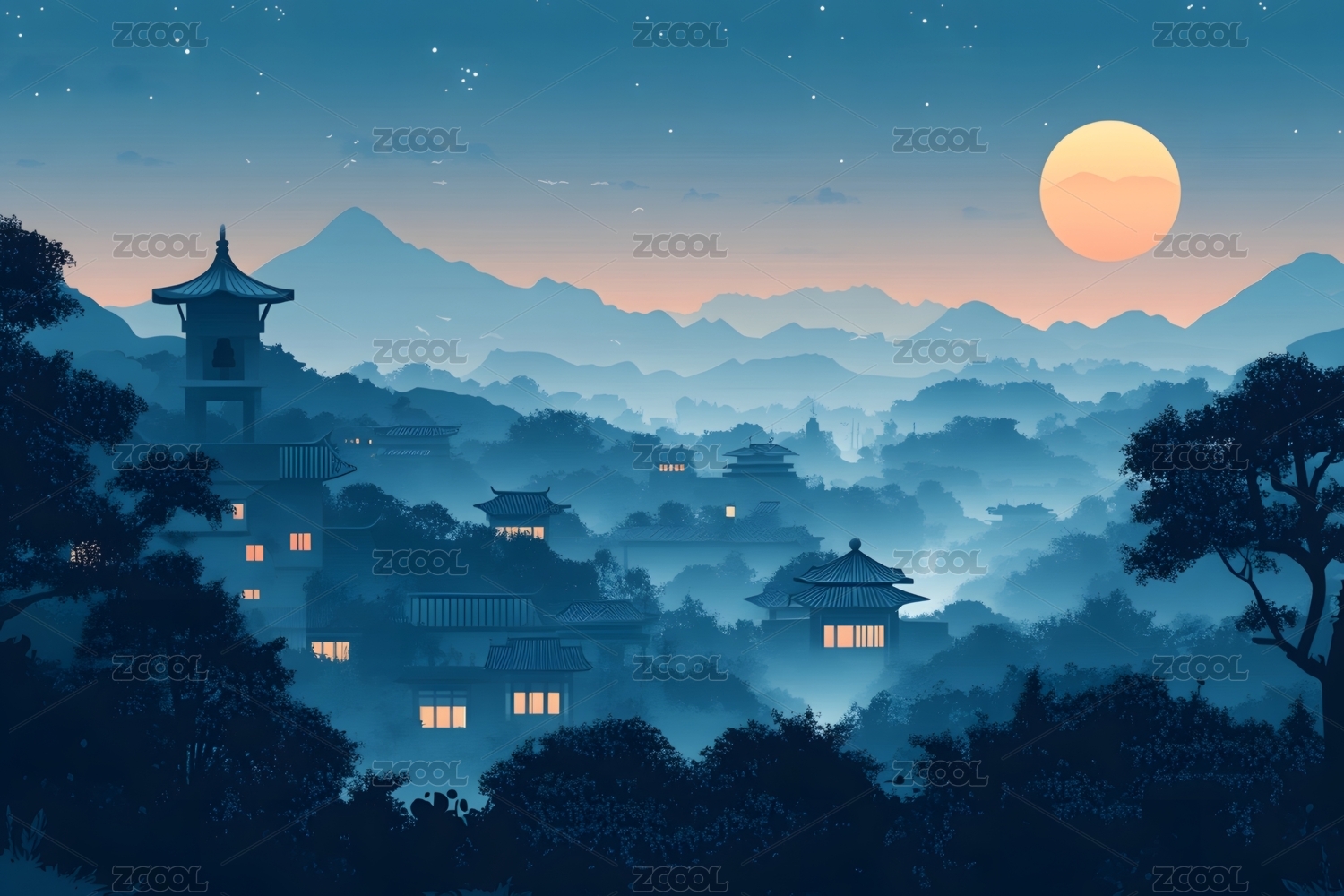 中国风中秋节月亮山水风景插画