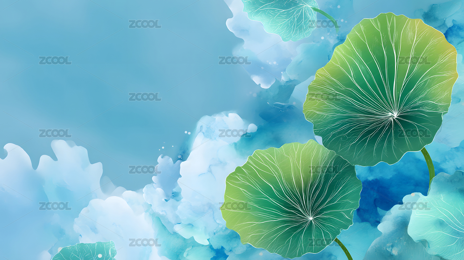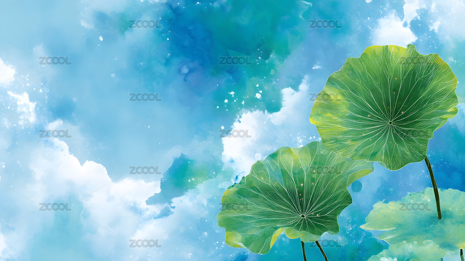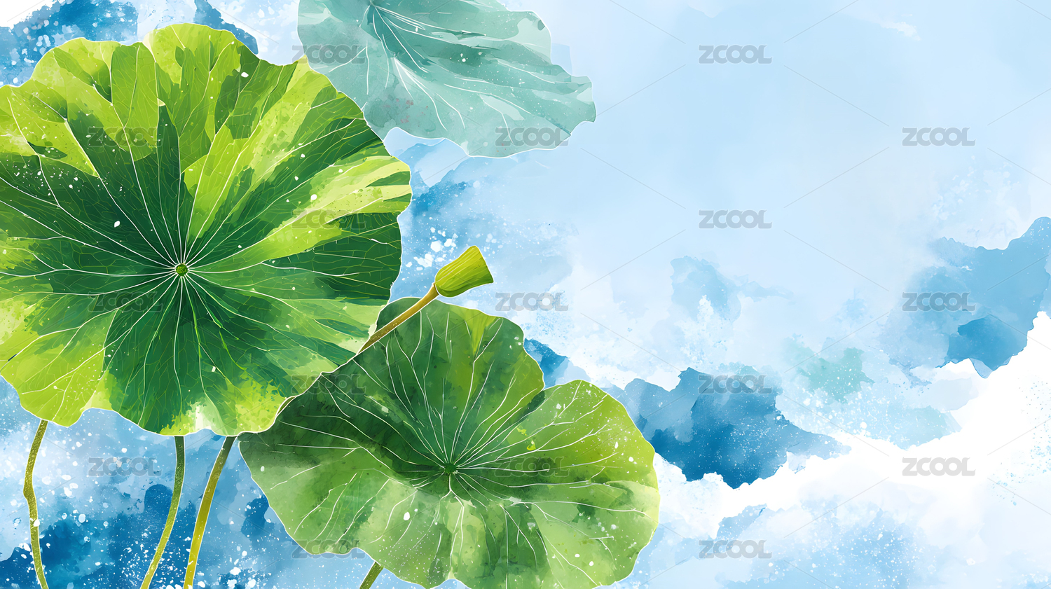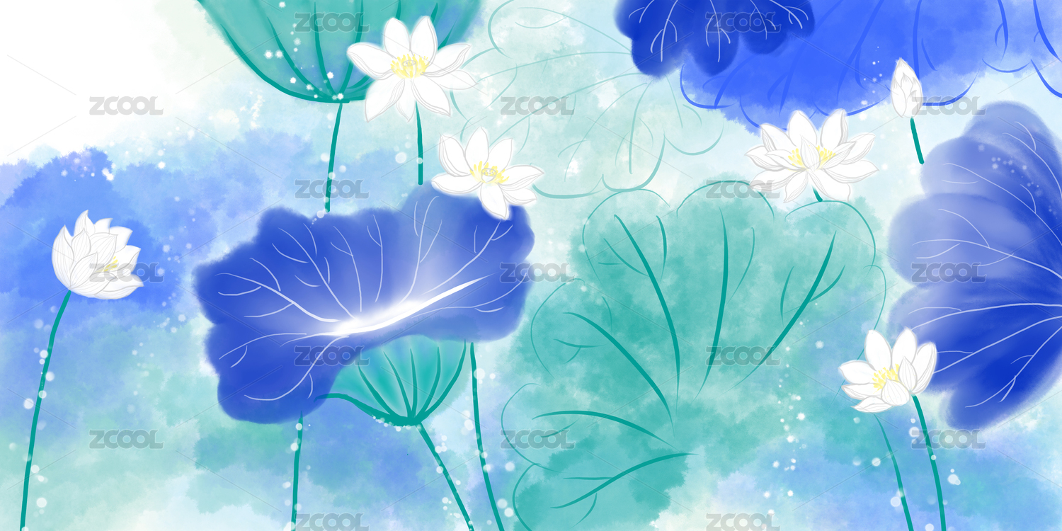 横幅蓝绿色清凉夏日荷花池塘背景插画