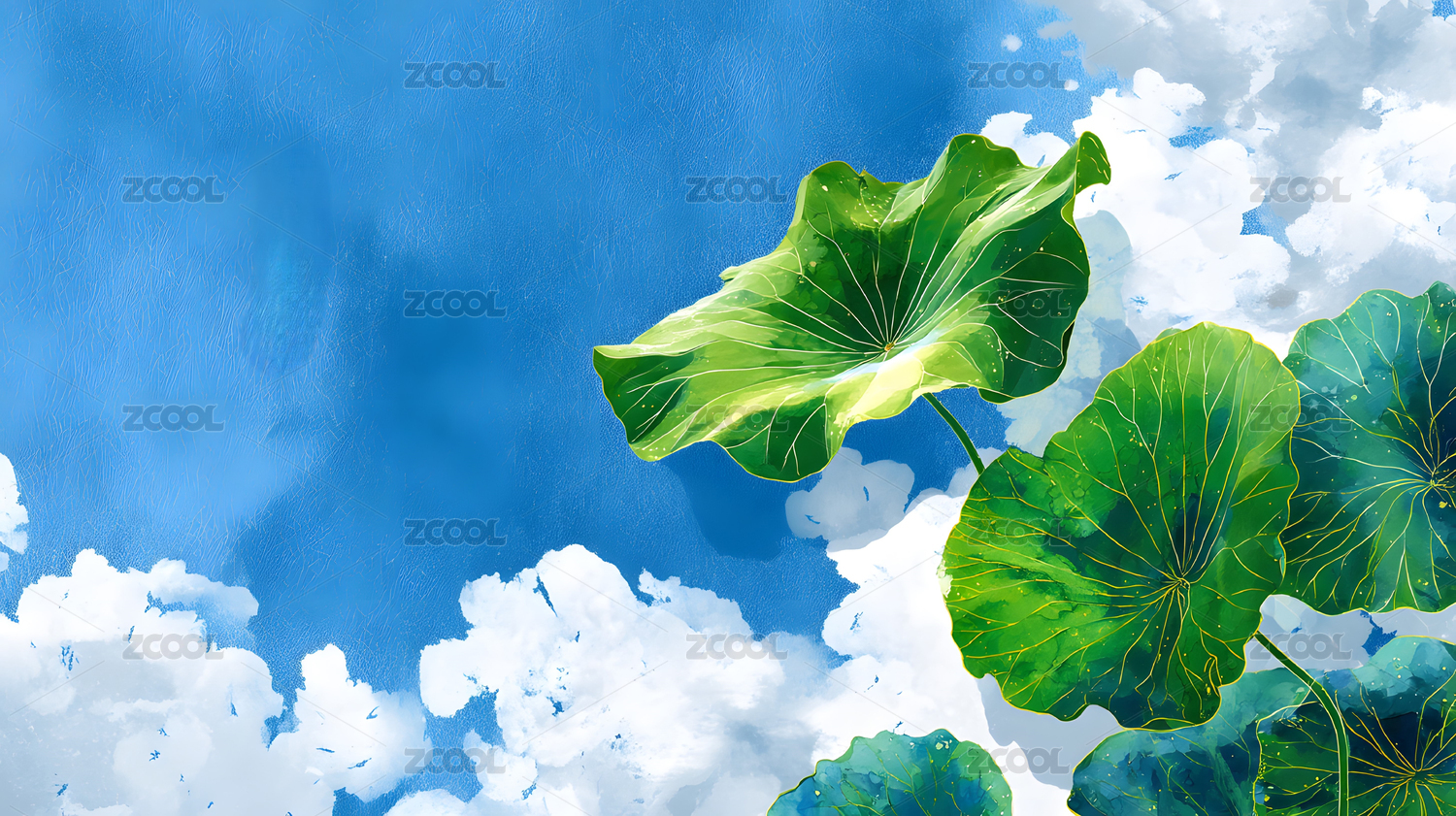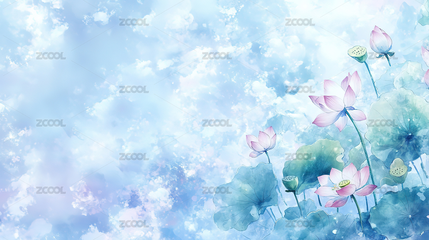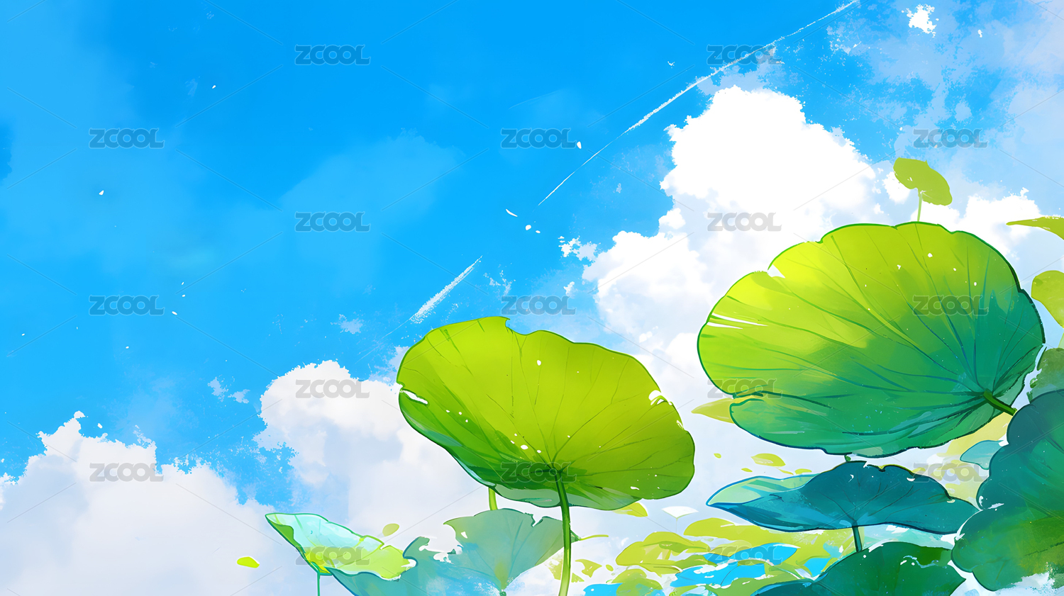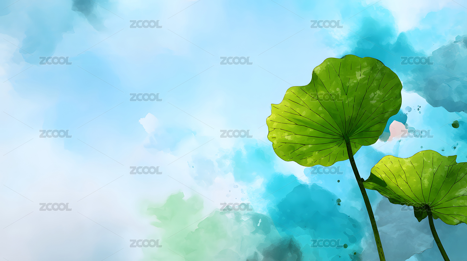 横幅蓝绿色清凉夏日荷花池塘背景插画