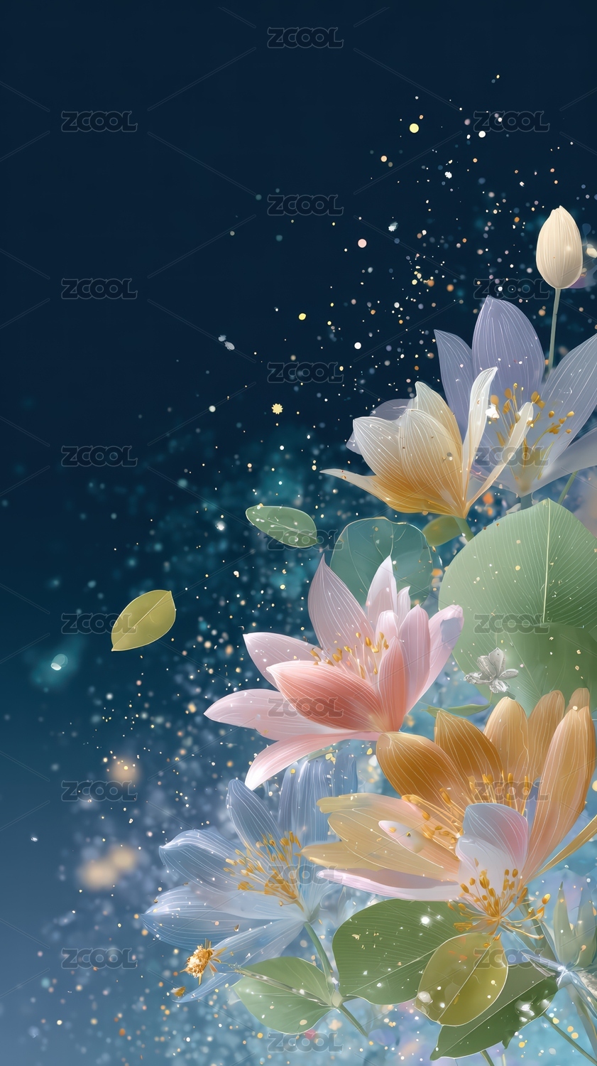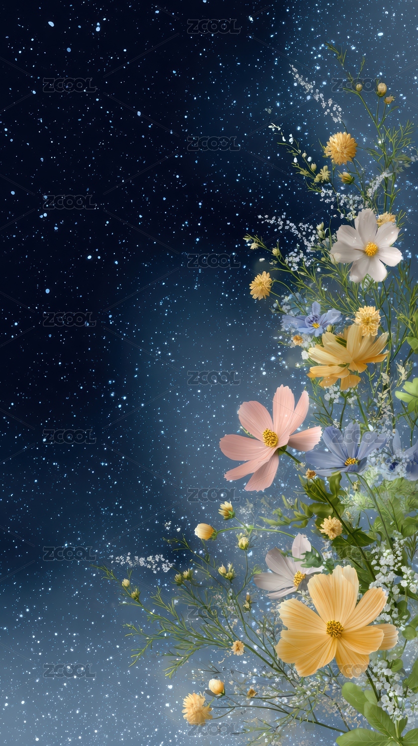 梦幻花朵点缀星空背景图