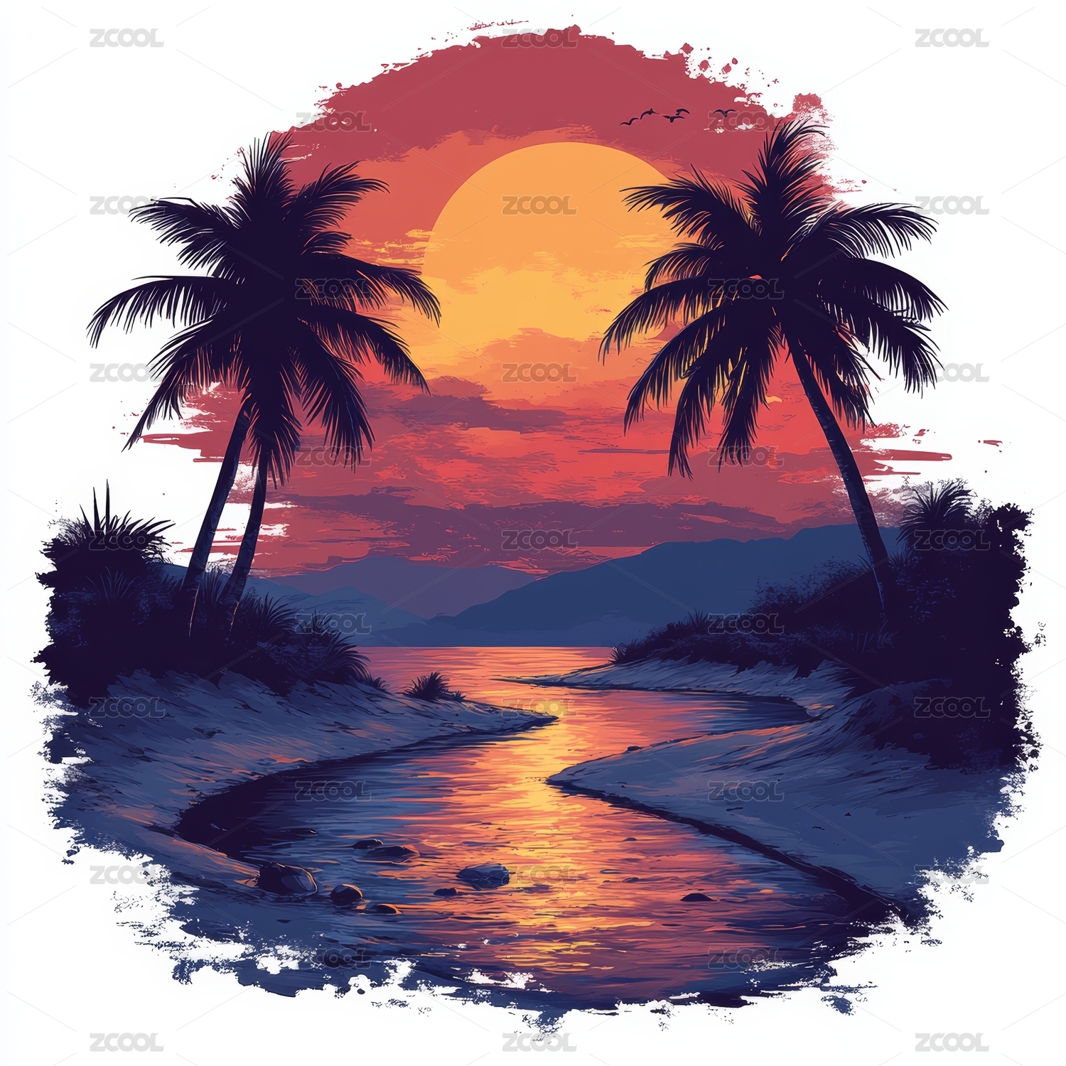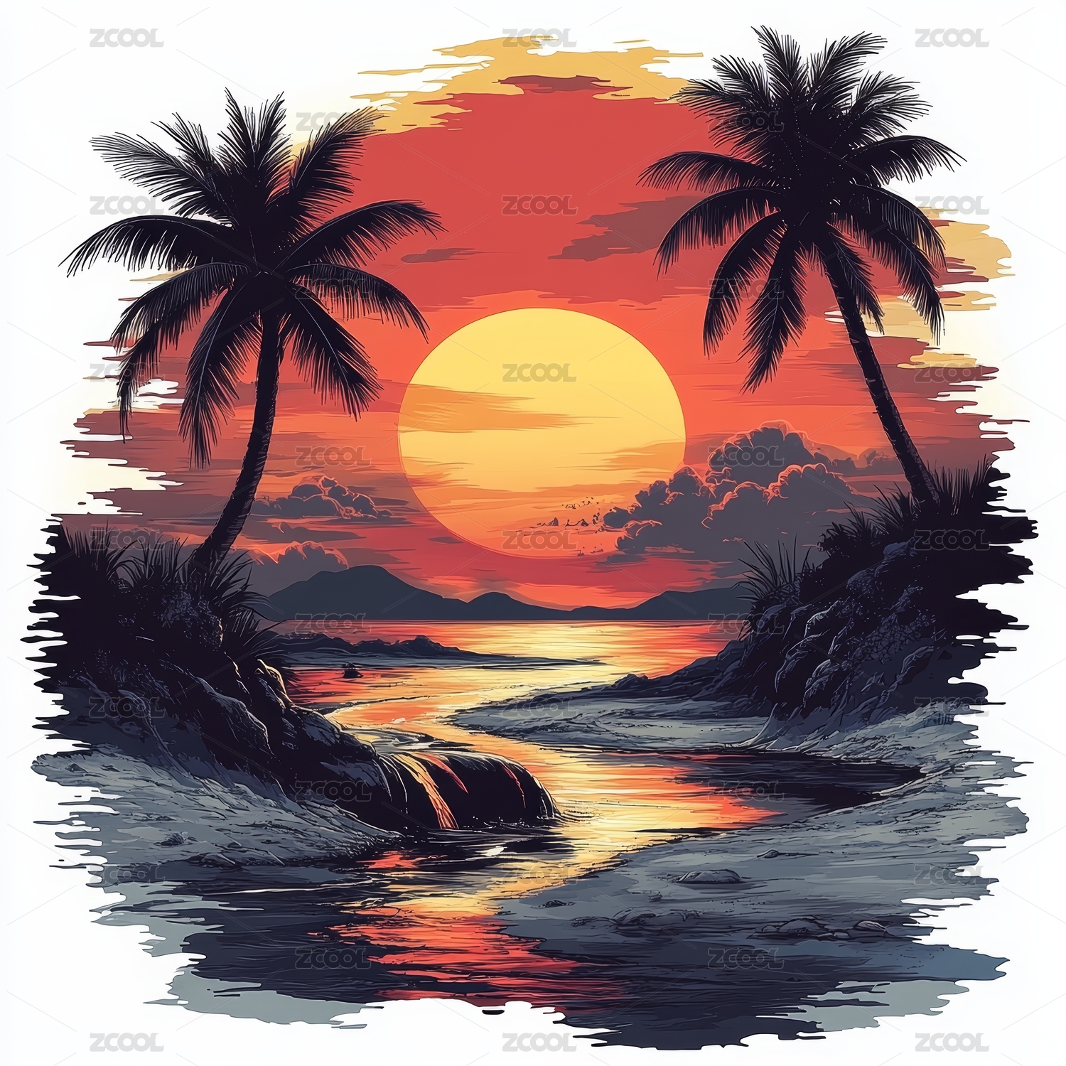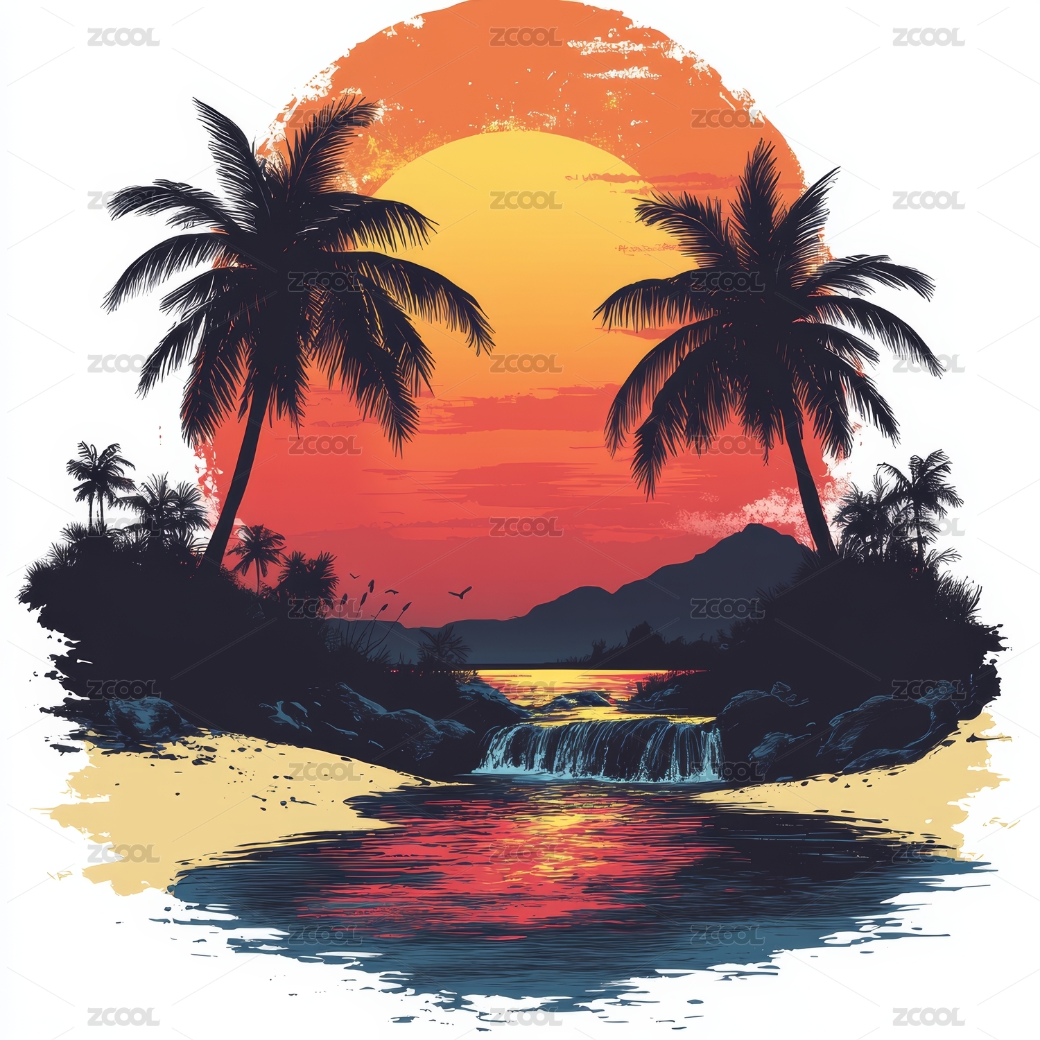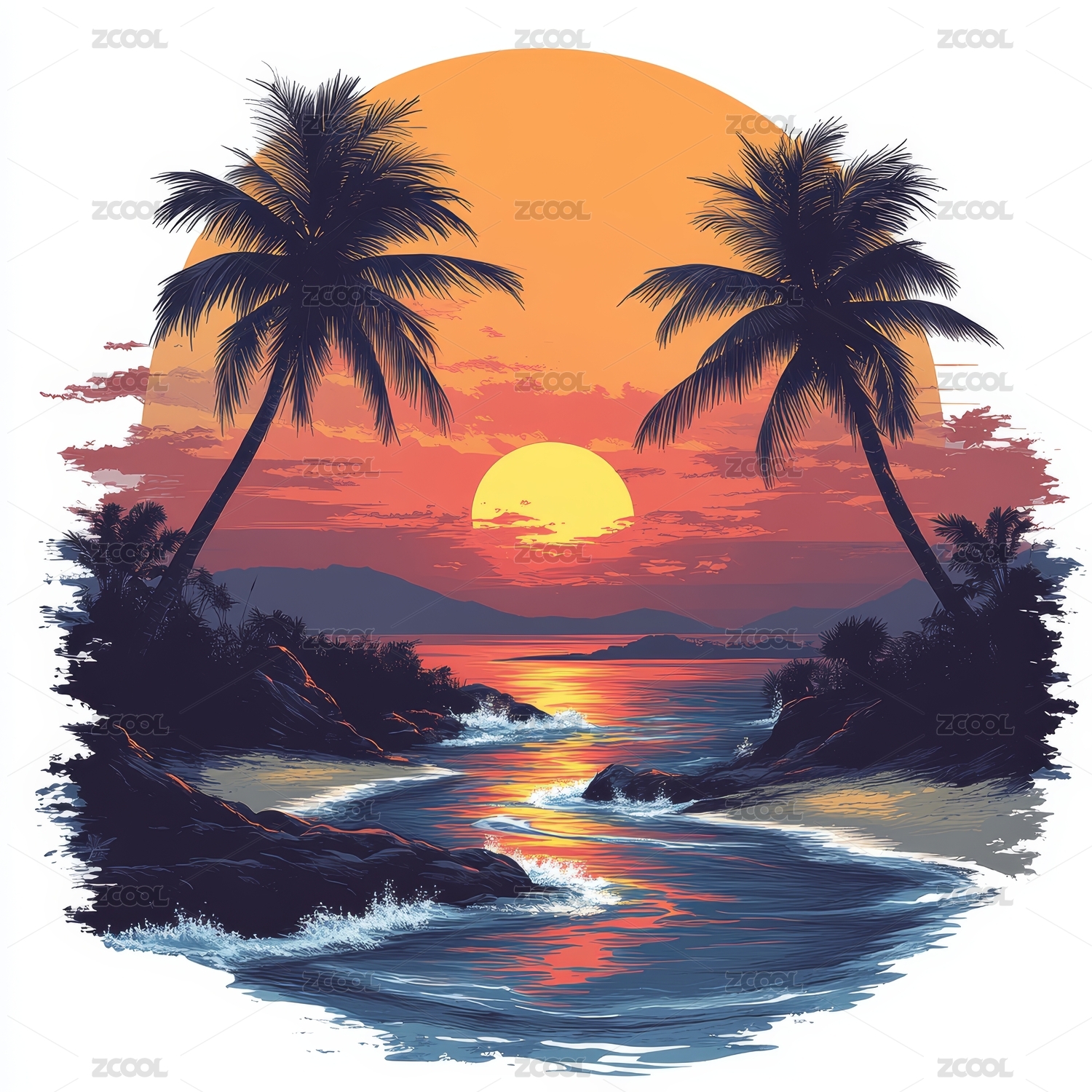 夏日日落时分的热带岛屿海滩与棕榈树的剪影