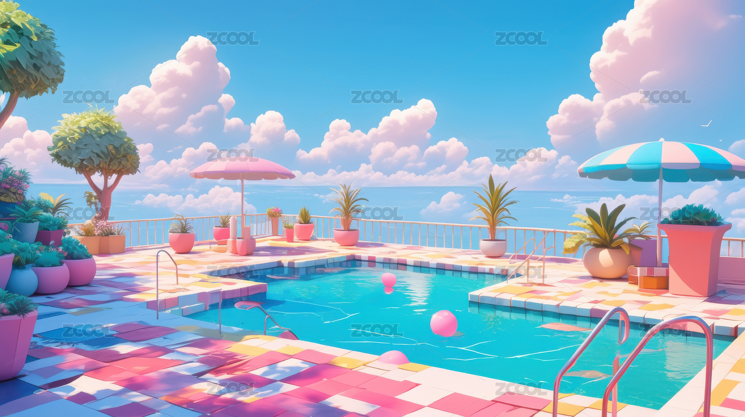3D卡通海边夏日泳池派对山峦蓝天白云