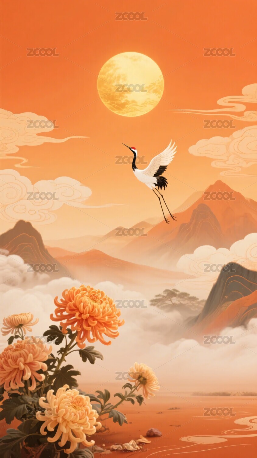 云朵,白鹤,秋山,红叶,流水,拱桥,圆月,飞鸟