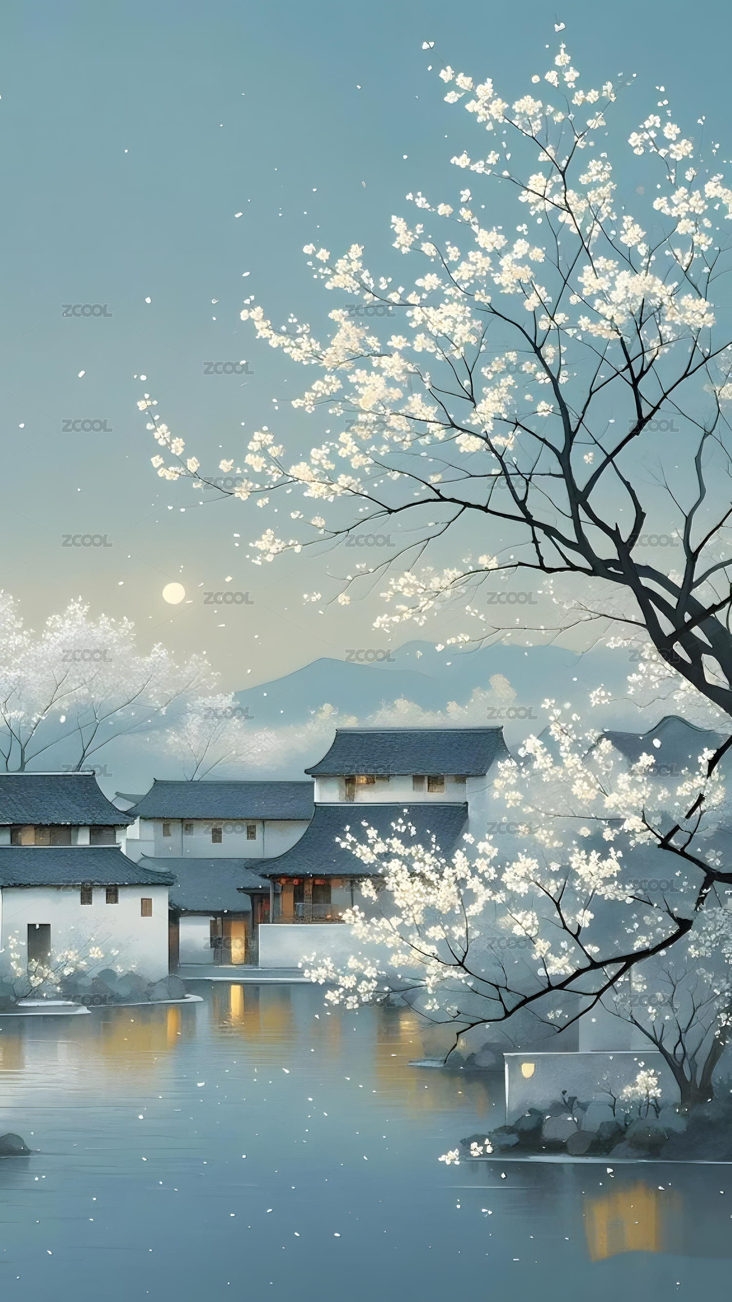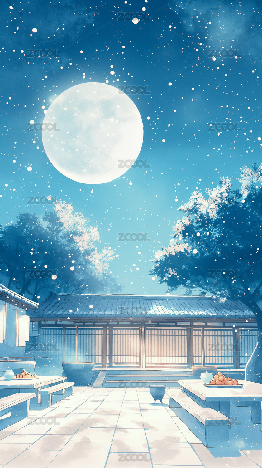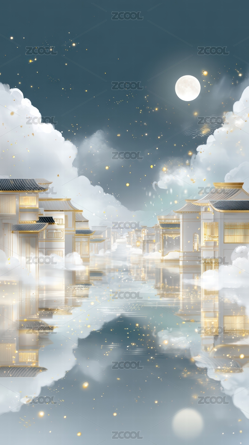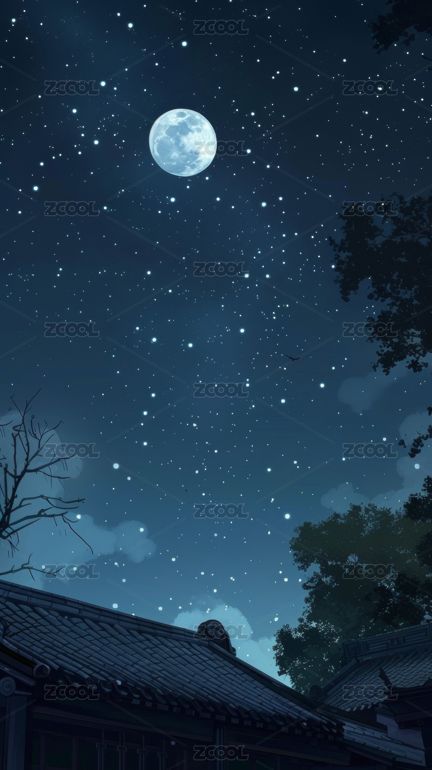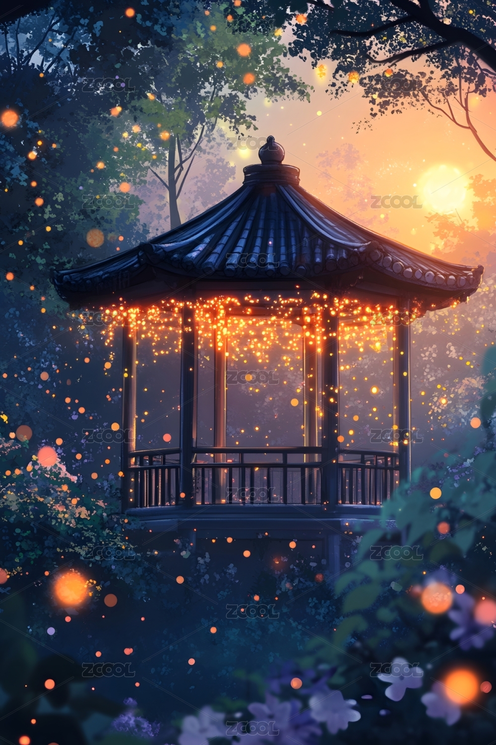 建筑,植物,云雾,静谧,灯笼,庭院,星光,月夜