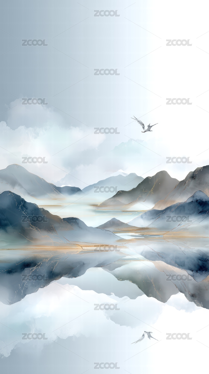 中国风意境水墨山水画竖版背景插画