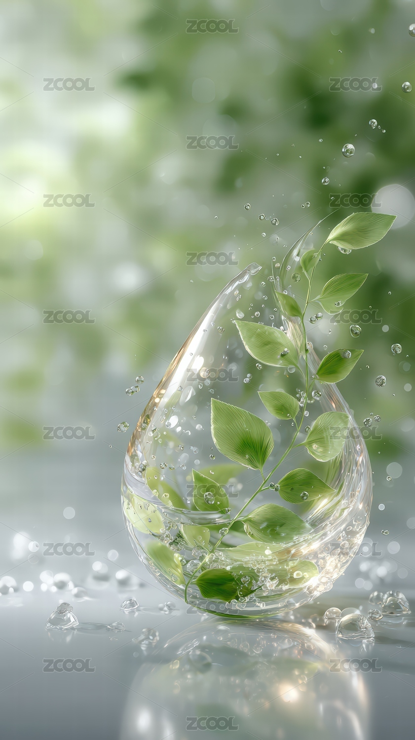 水球包裹新生绿叶的艺术展示