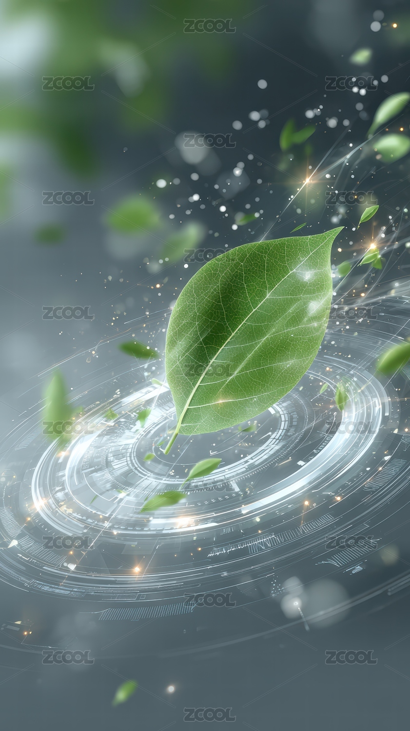 绿色叶片与科技漩涡的交融景象