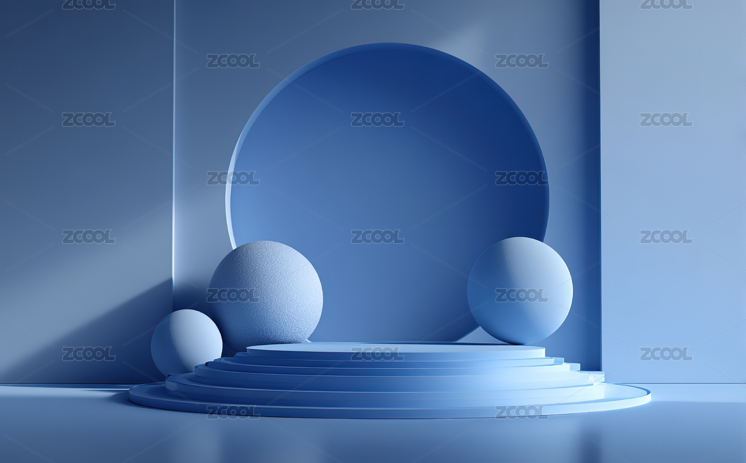 蓝色几何空间中的球体与台阶