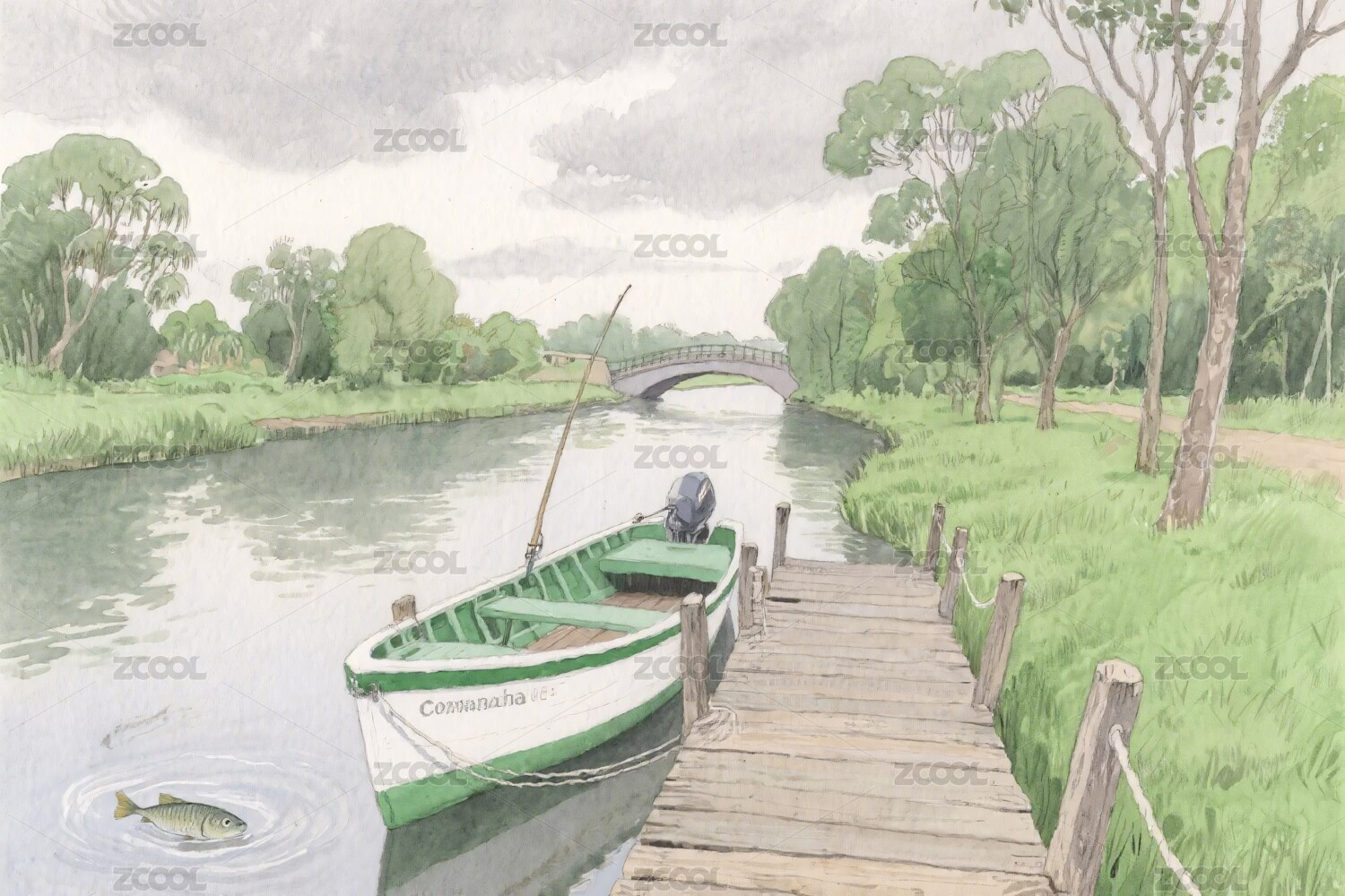 小船,水面,湖水,树木,自然,风景,插画,静物,水域,船只
