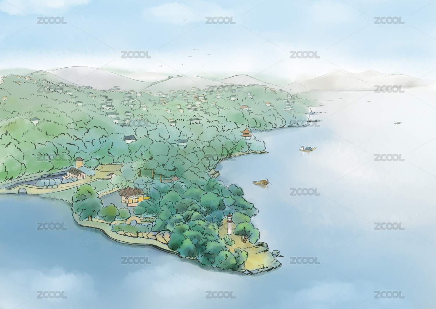 岛屿,山水,树木,湖泊,微缩,风景,插画,自然,树林,绿植