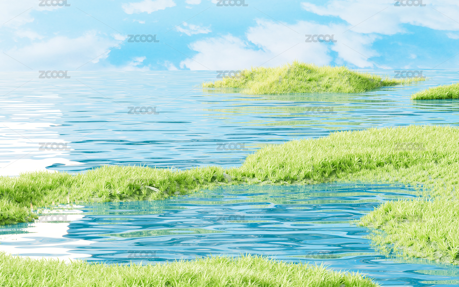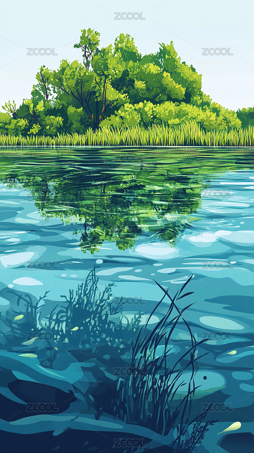 清新明亮俯视航拍湿地湖泊的水草水藻插画