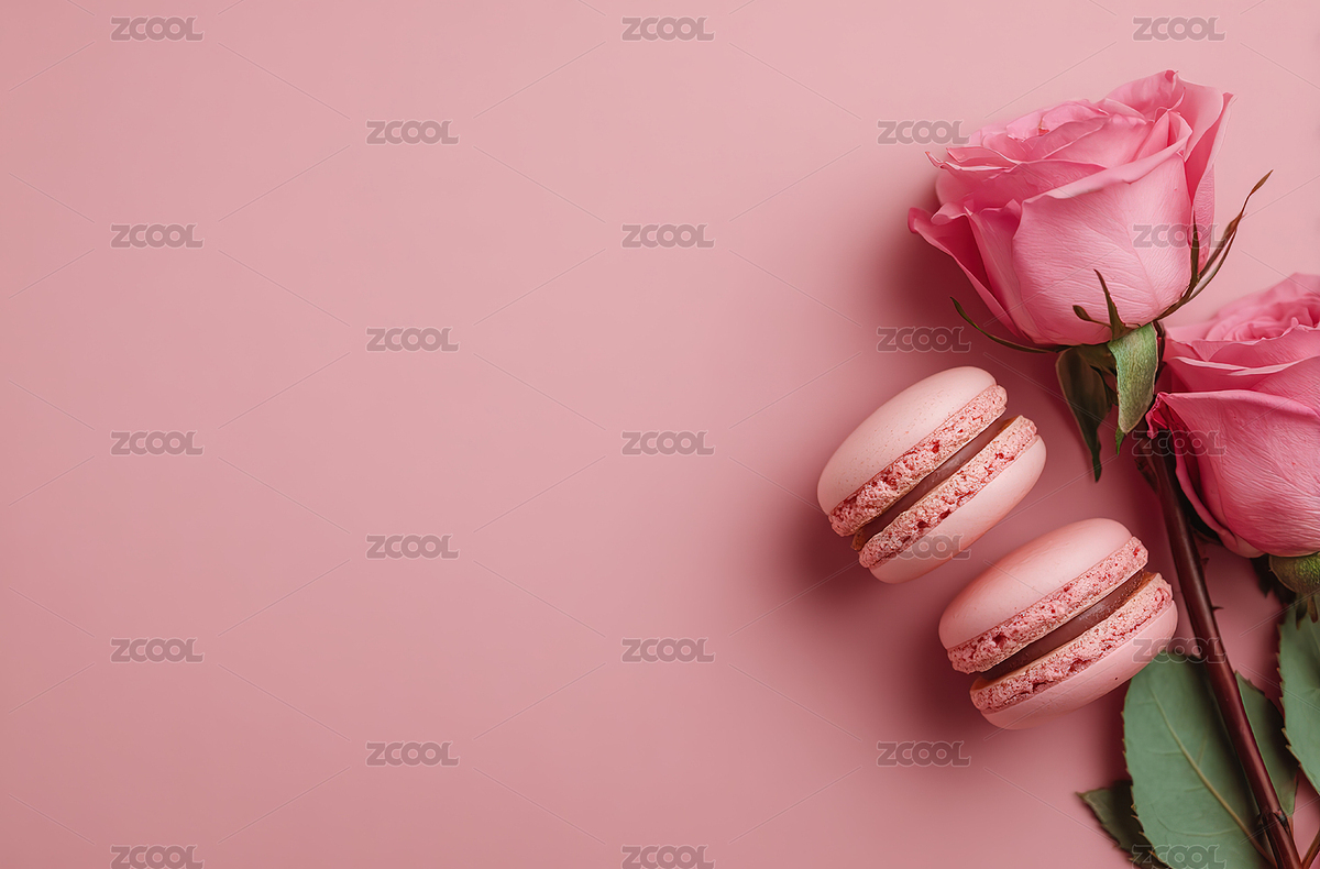 粉红色背景下的杏仁饼和玫瑰的高角度视图