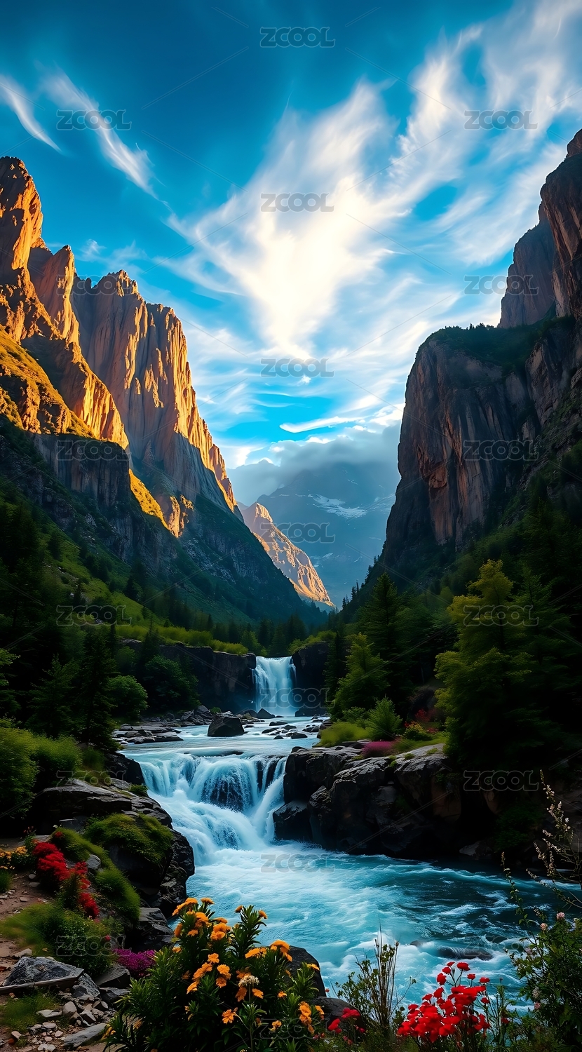 瀑布从峡谷上倾泻而下,溪流从远方流淌而来