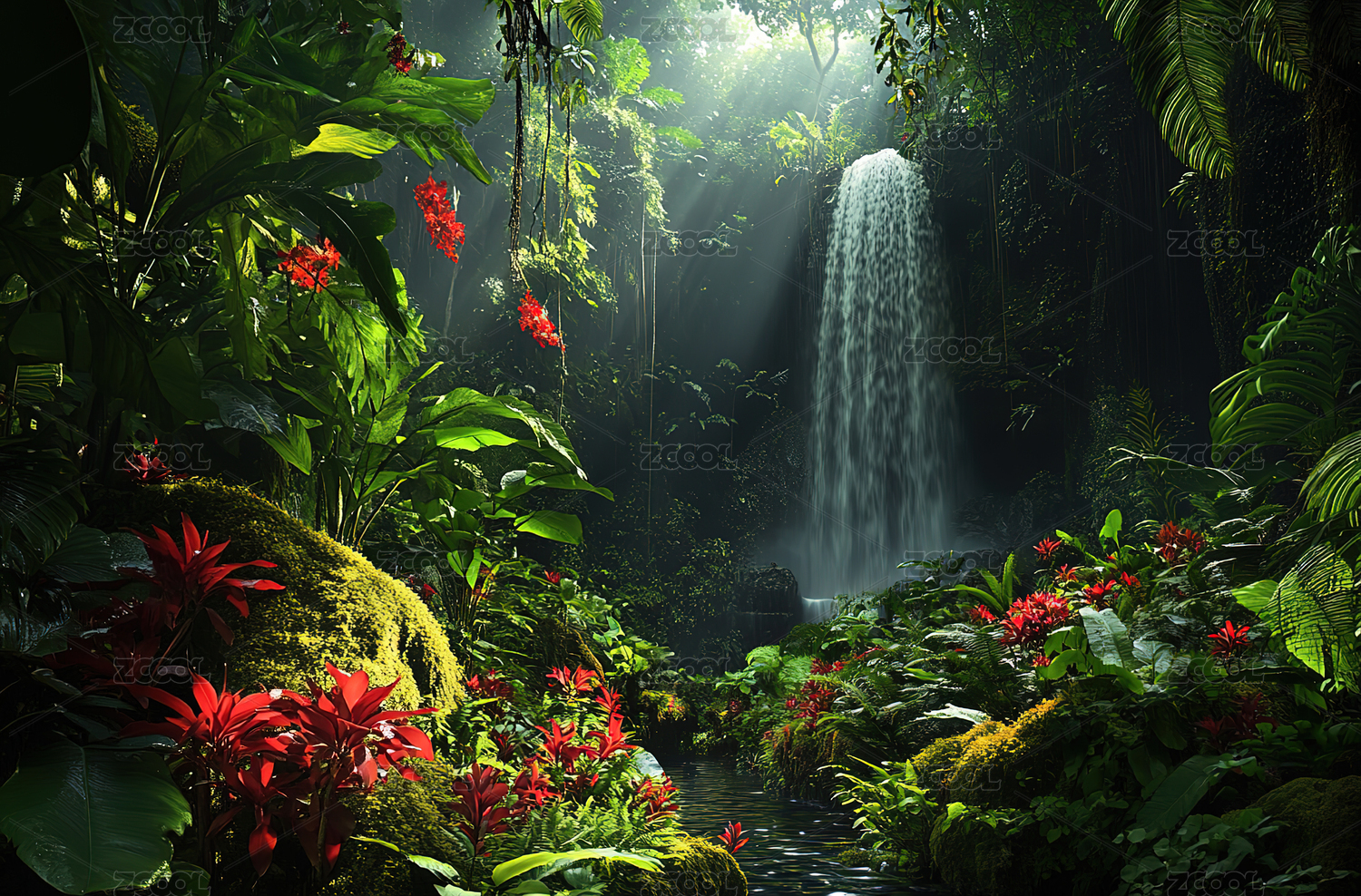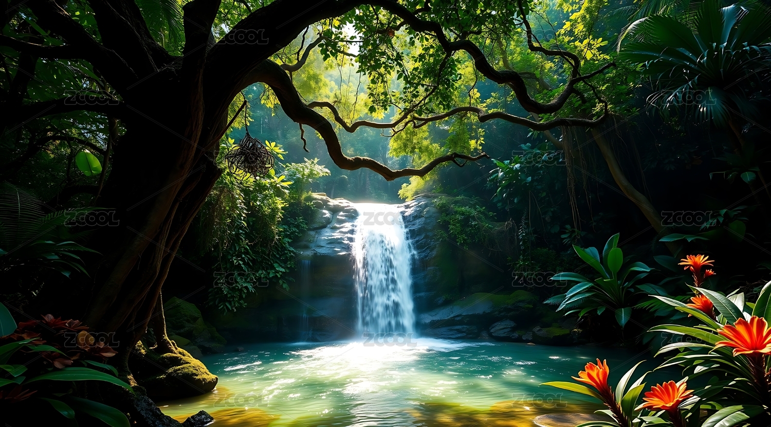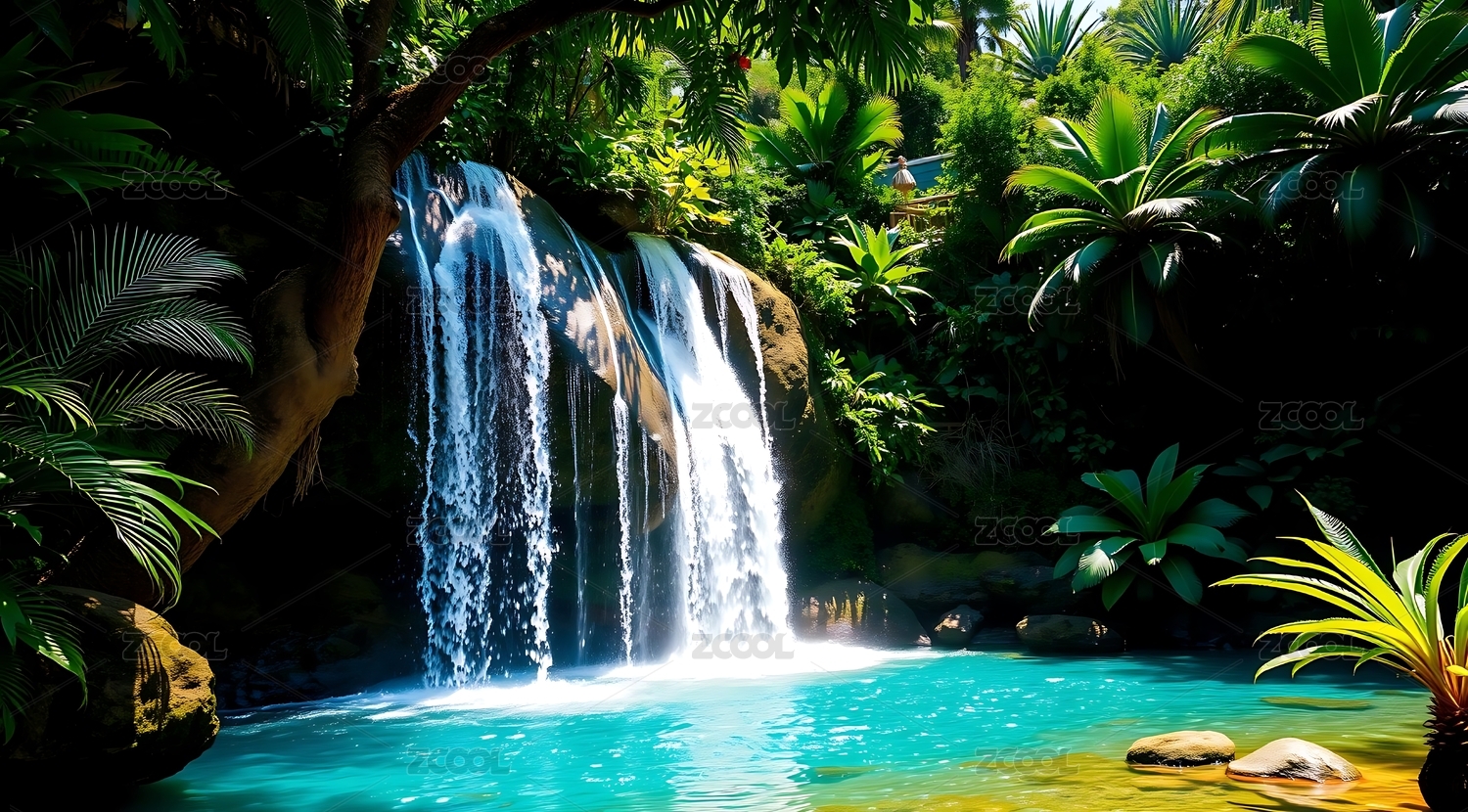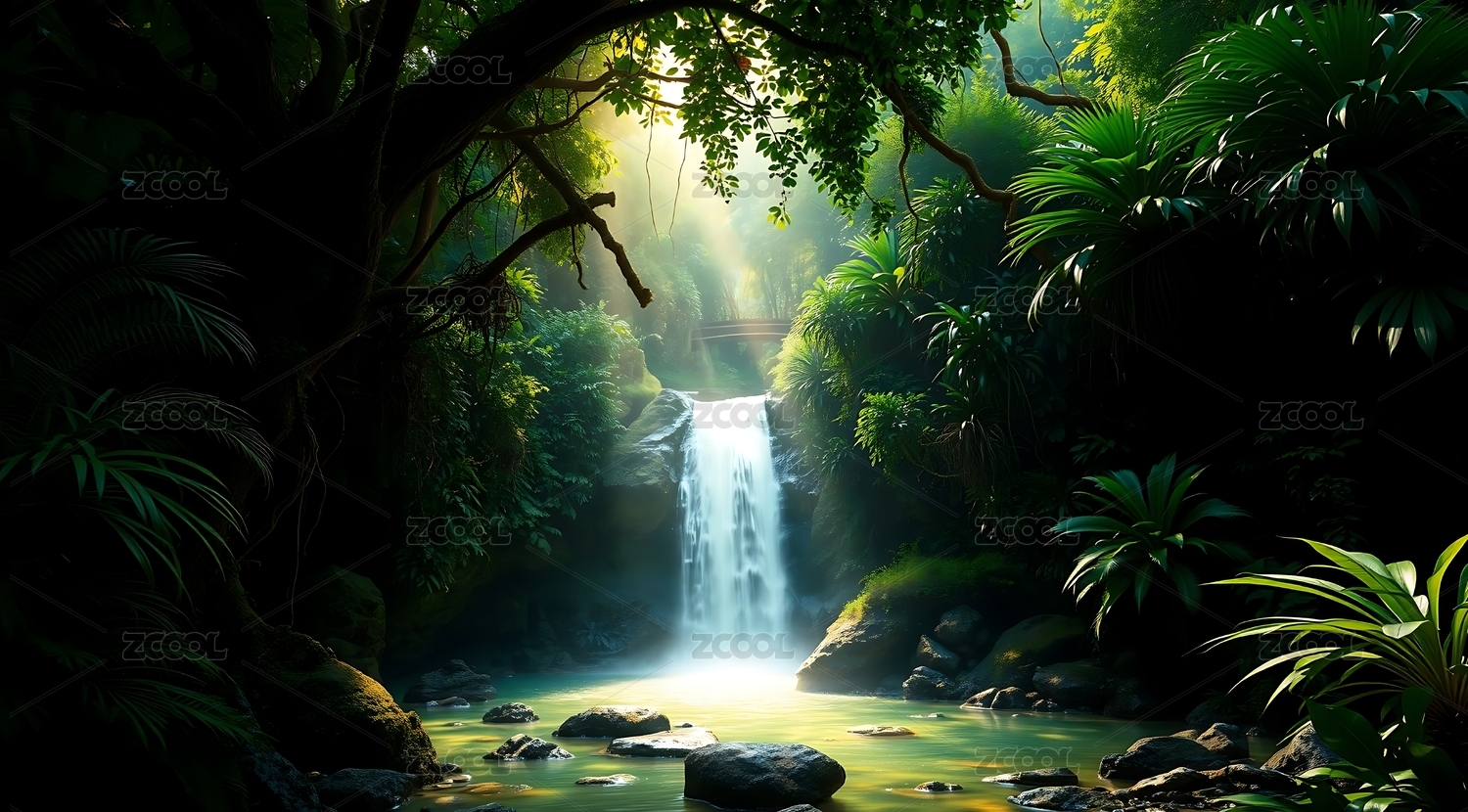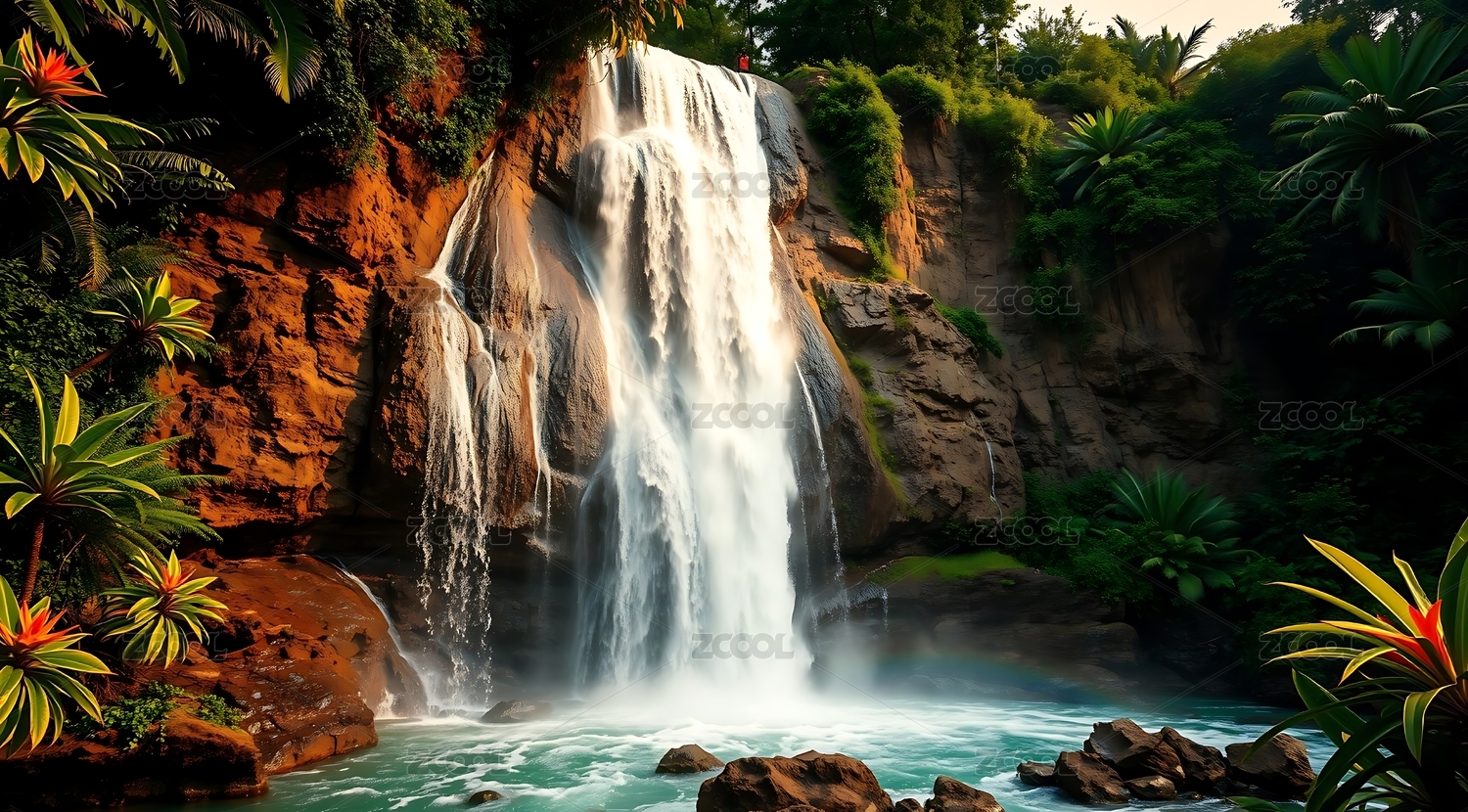 瀑布, 湖泊, 绿树, 山脉, 雾气