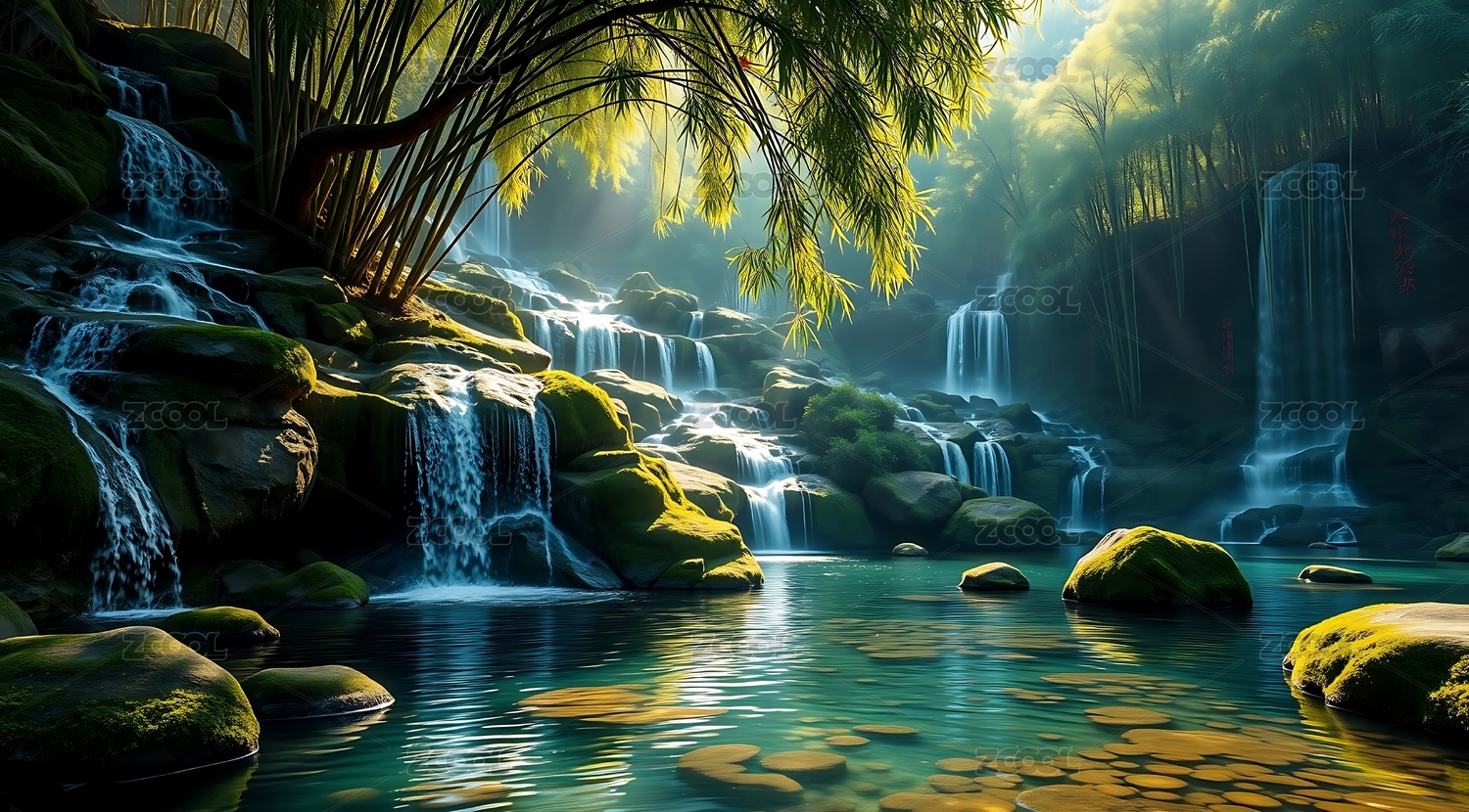 绿意盎然的丛林中缓缓流淌的小溪特写
