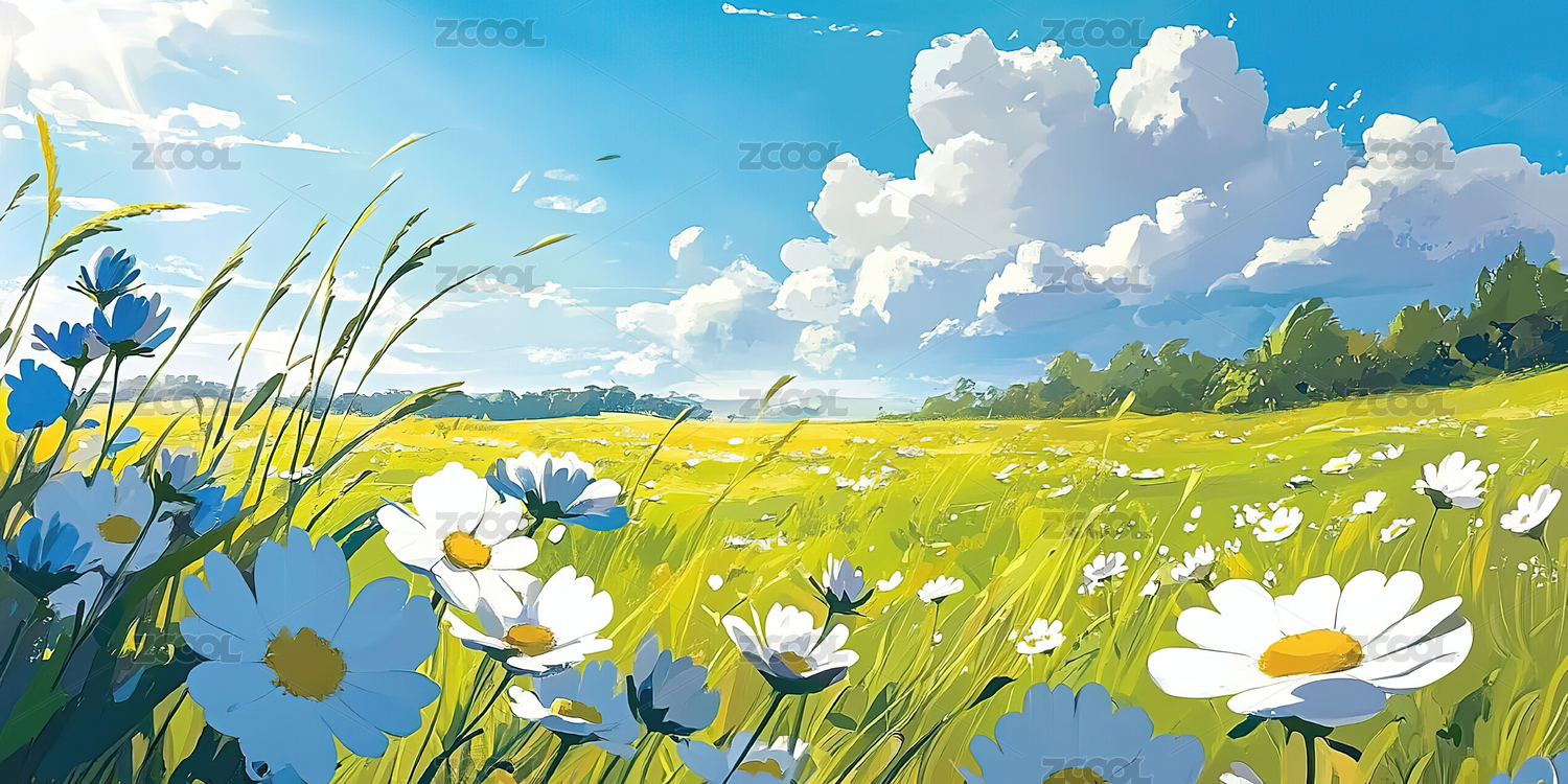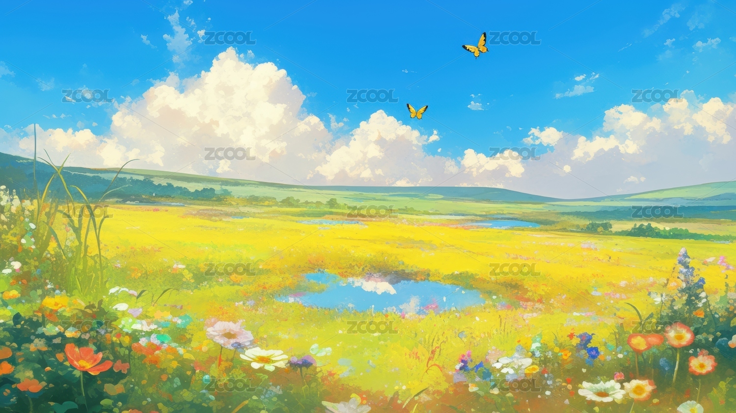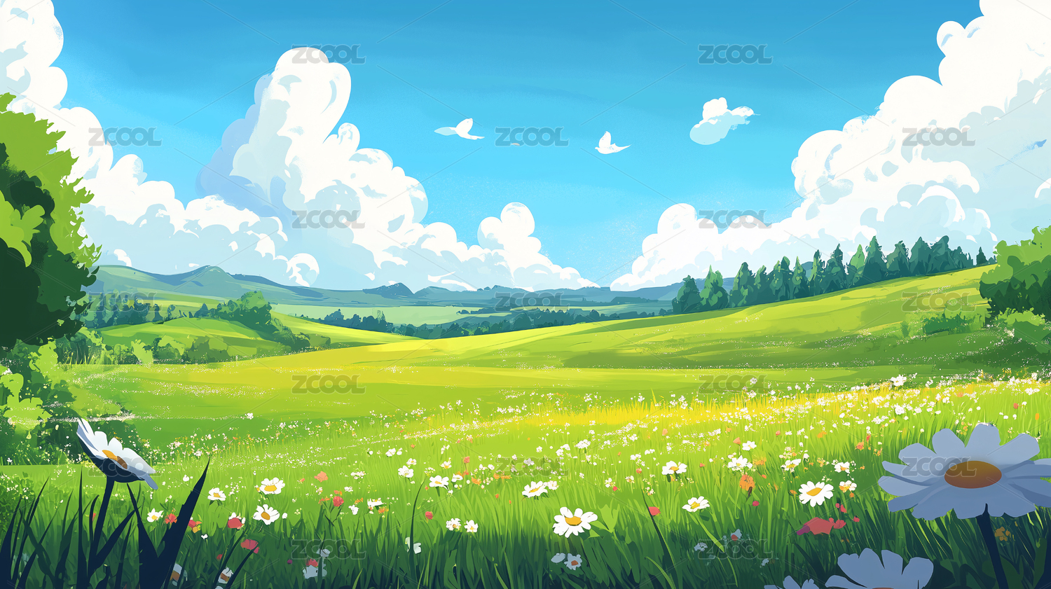 夏天户外旅行山峰房屋乡村风景蓝天白云插画