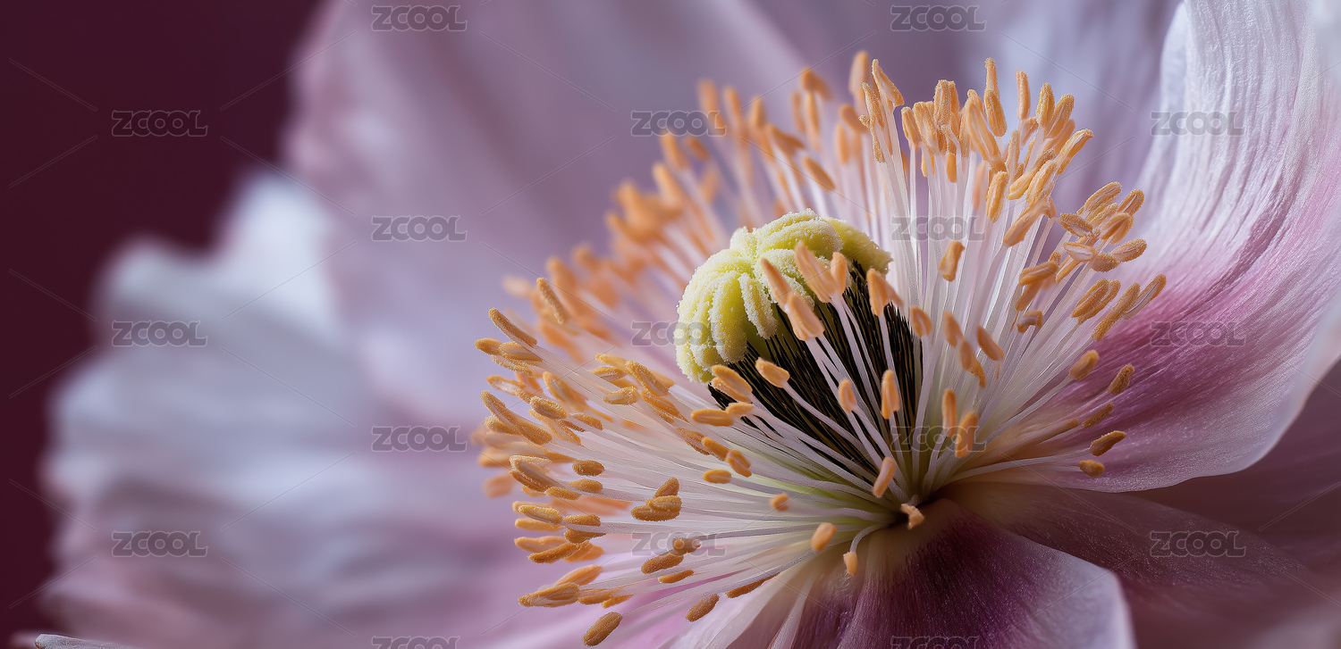 特写浅粉花朵花蕊橙黄雄蕊与绿色雌蕊清晰呈