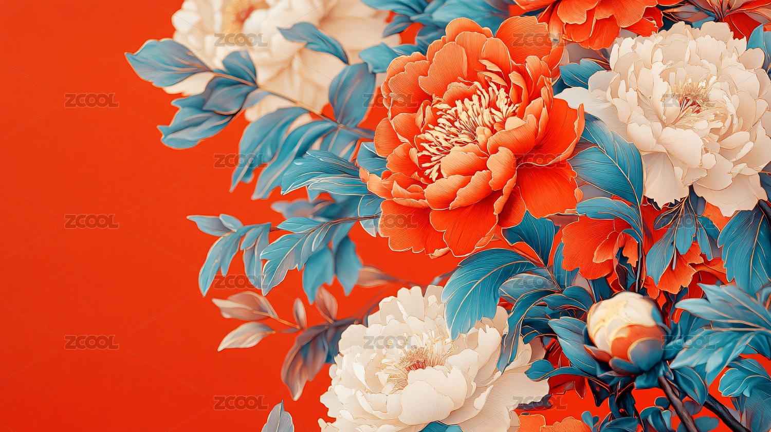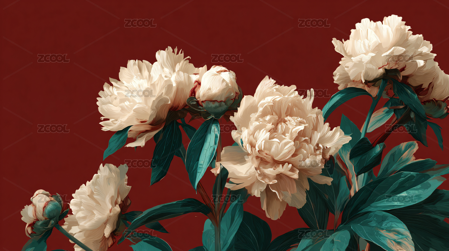 红背景上的绚丽牡丹花卉