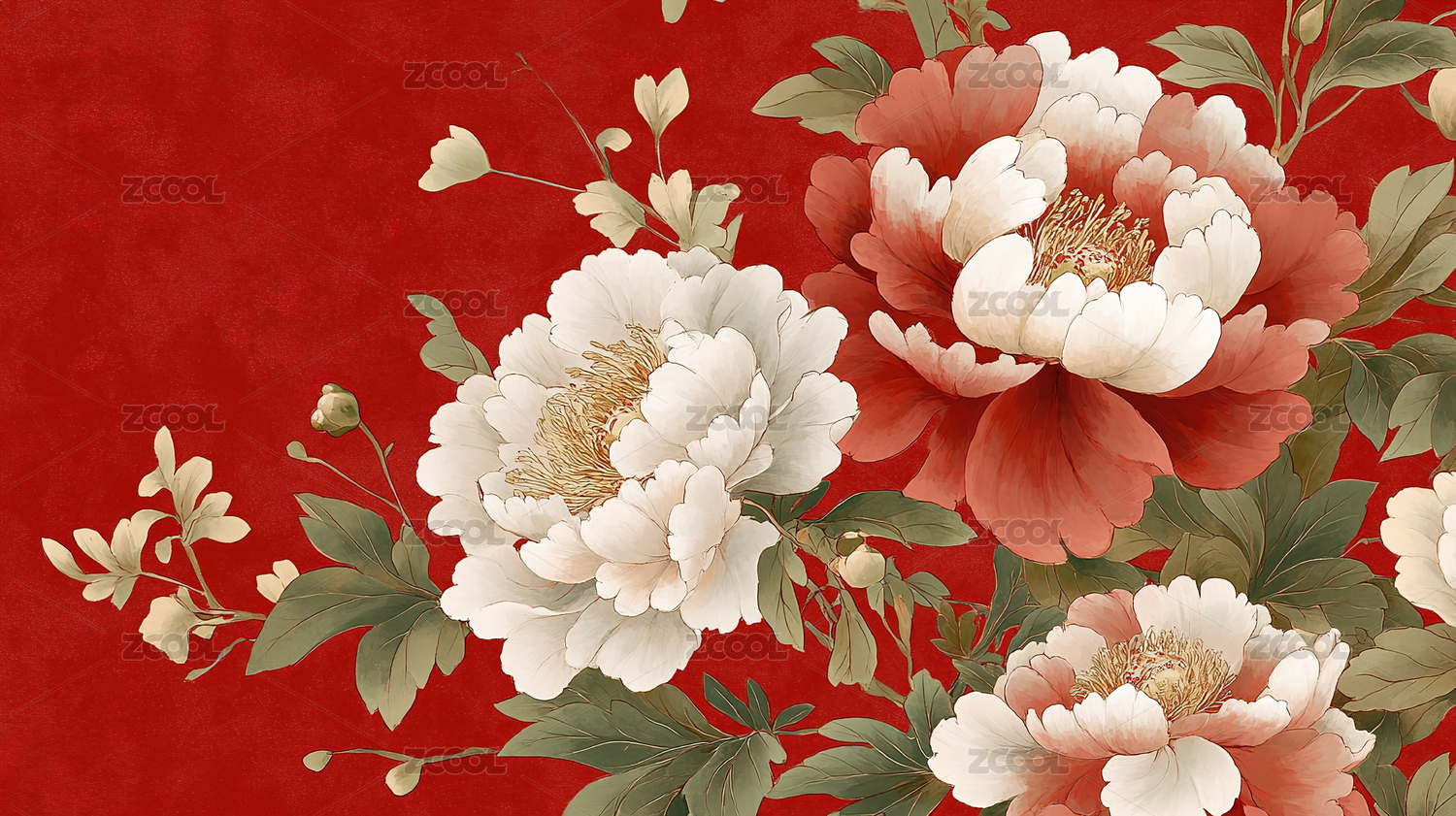 牡丹,红底,白花,装饰,国画,典雅,花卉,中式,富贵,工笔