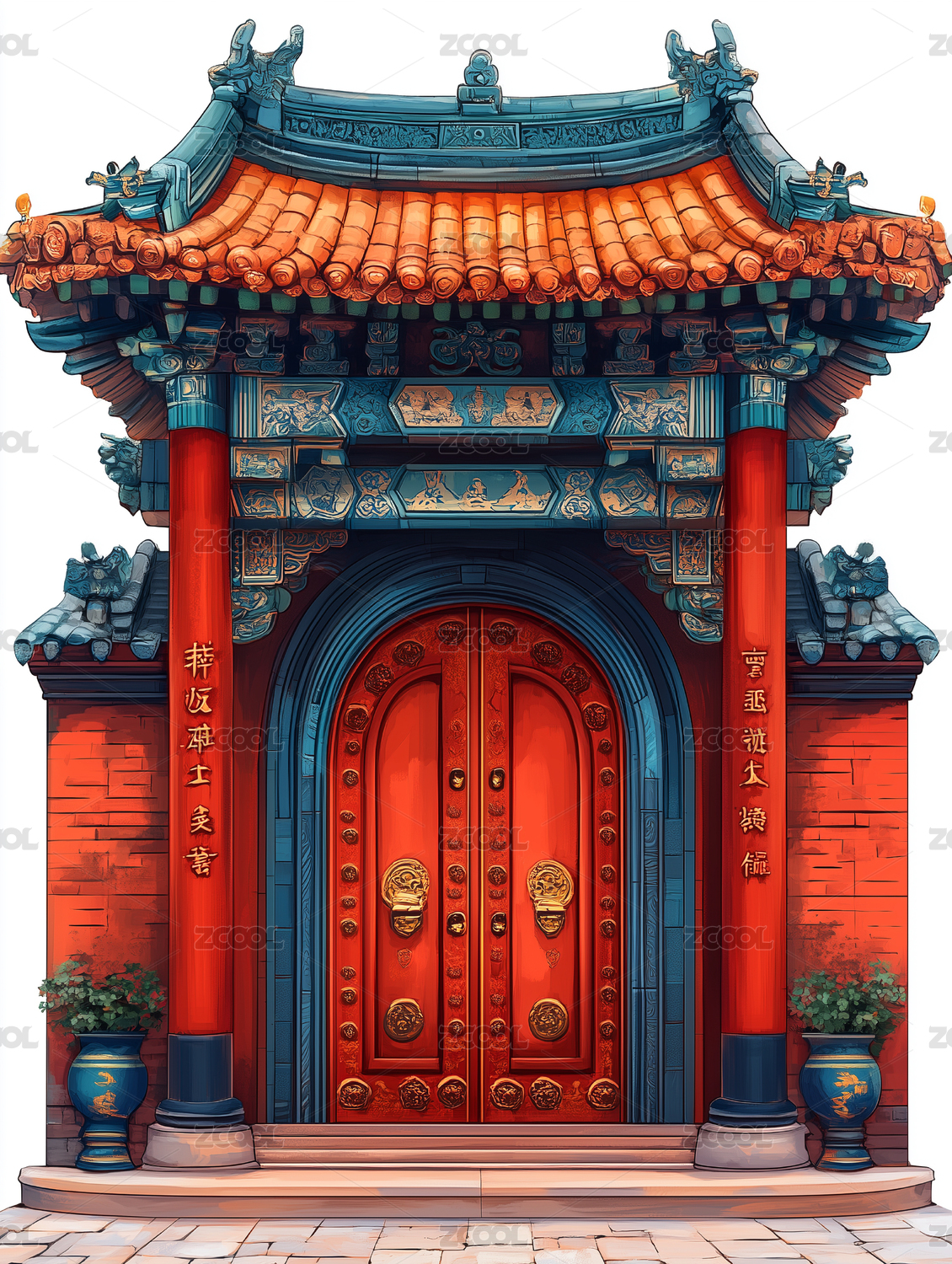 牌坊门楼手绘插画