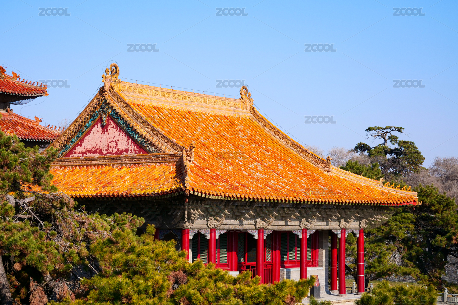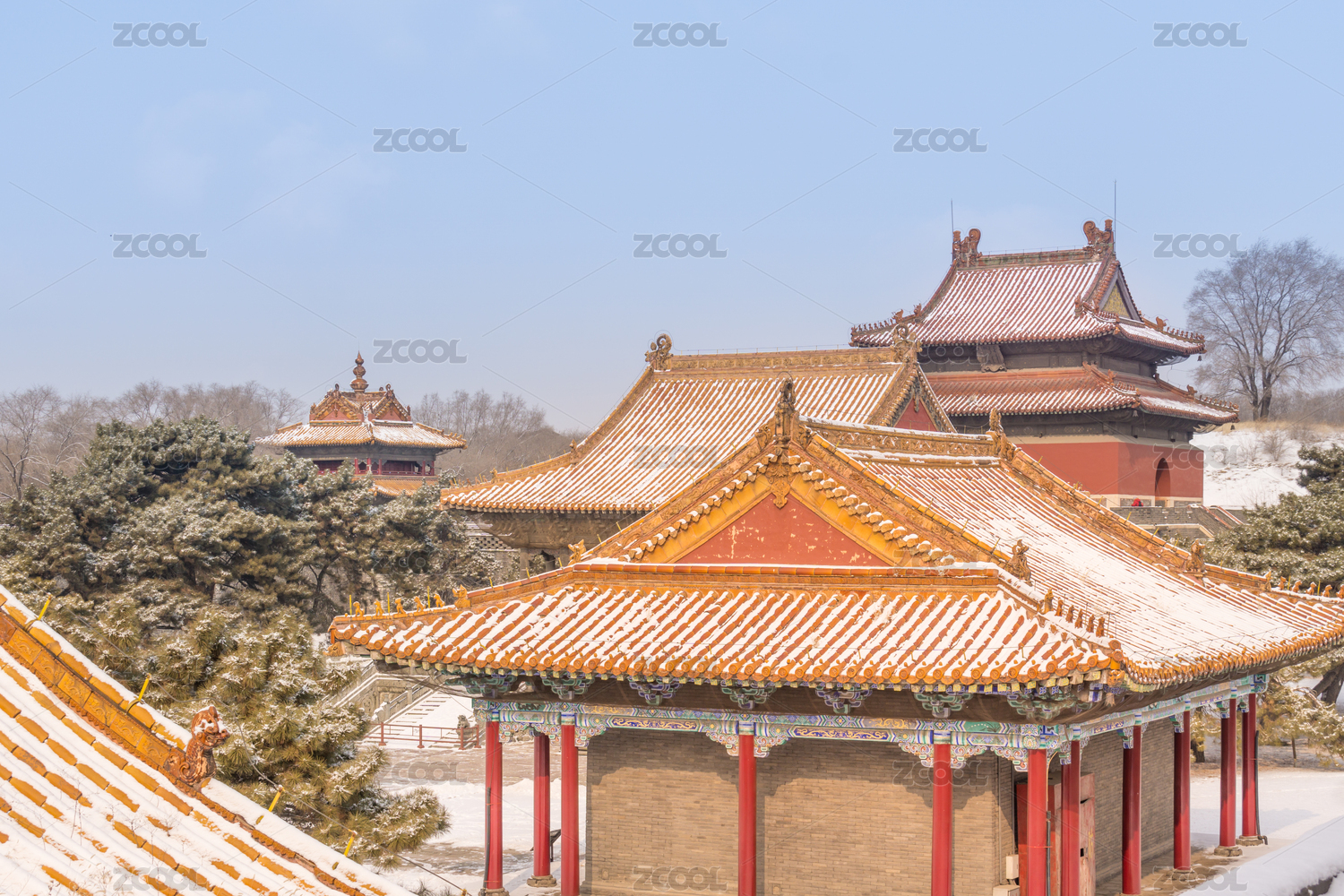 冬季雪后中国辽宁沈阳清昭陵的宫殿和屋顶