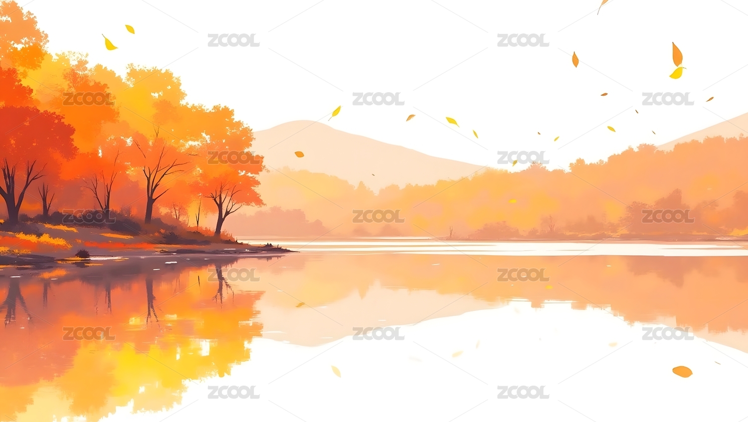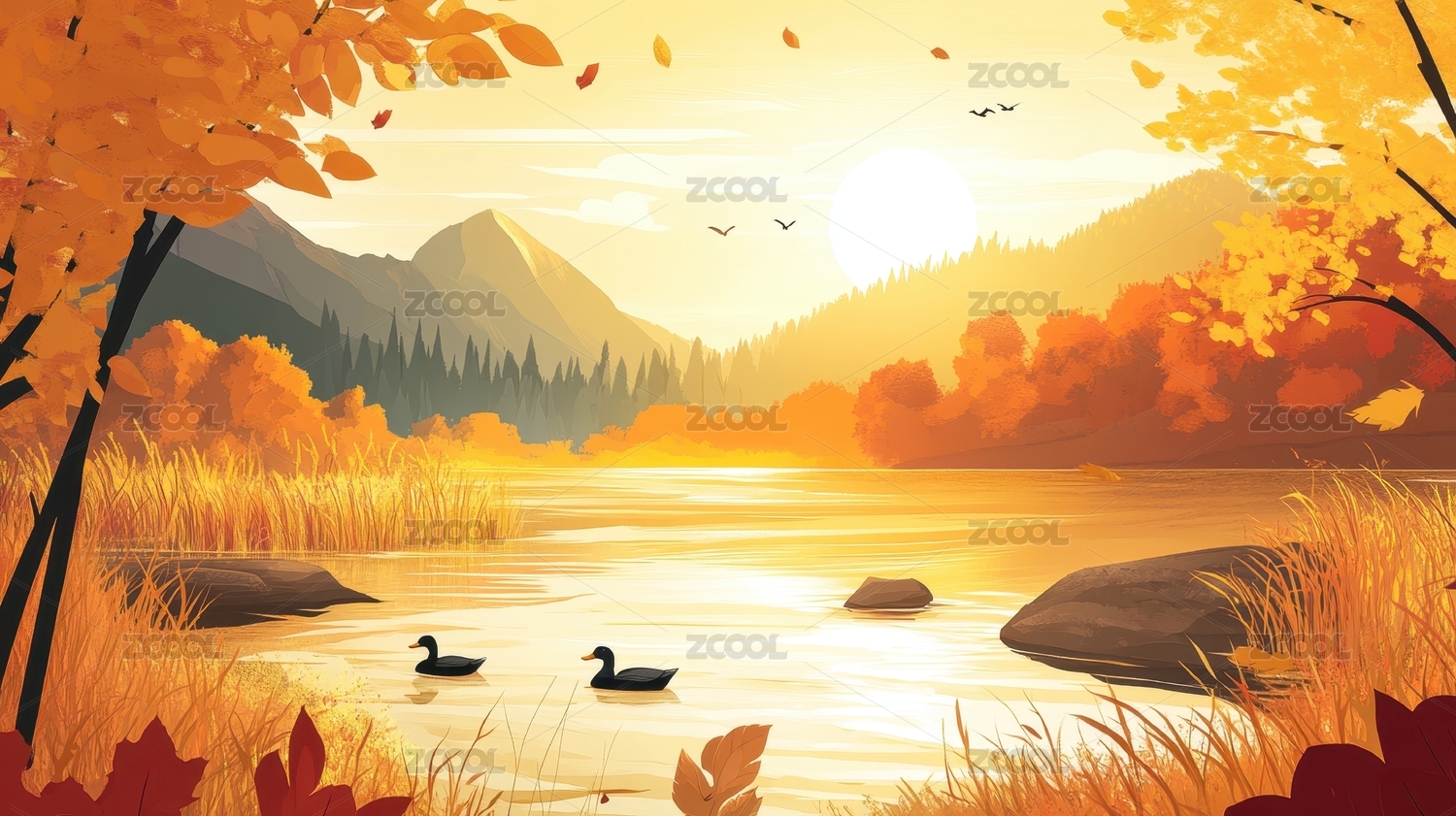 秋天宁静的金黄色树林与湖面风景插画