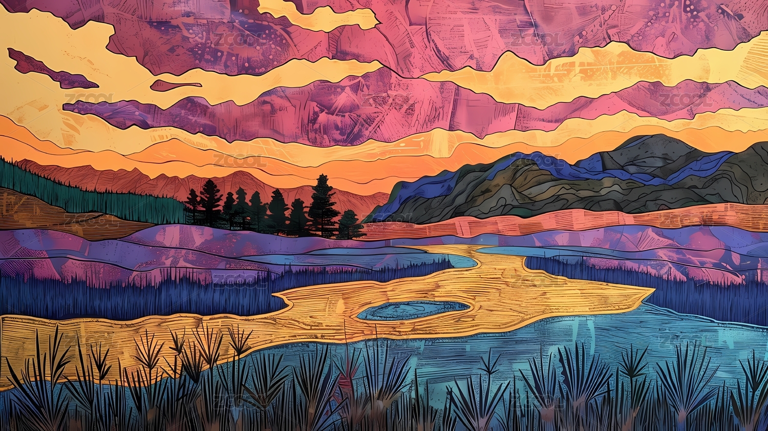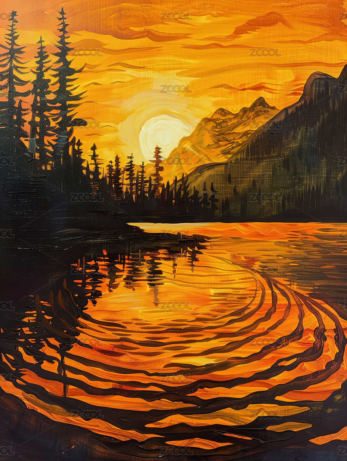 山水,湖水,树林,山脉,风景,插画,艺术,装饰,自然,静谧