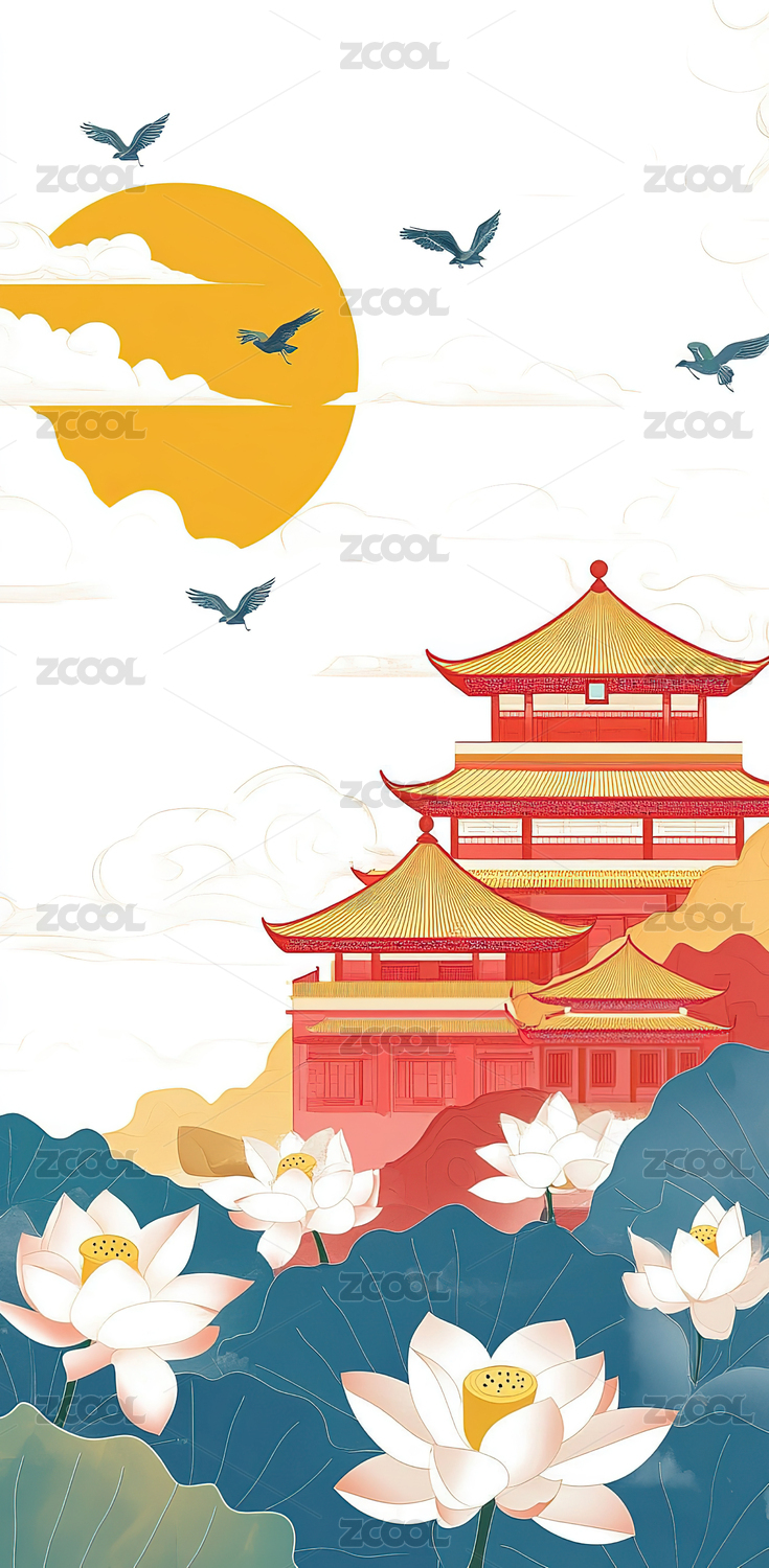 中秋节月亮与古建筑国潮风格插画