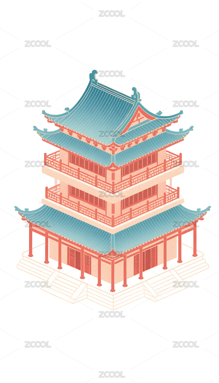 中式,传统,国潮风格,素材,插画,古建筑,立体