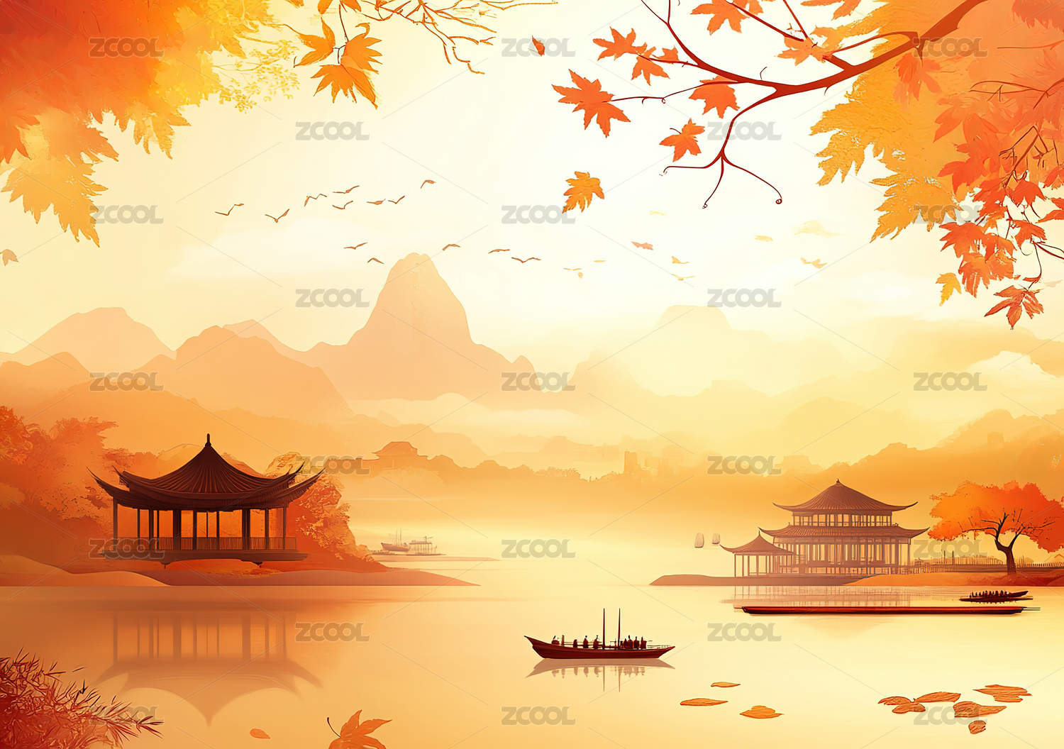 秋日湖畔亭台