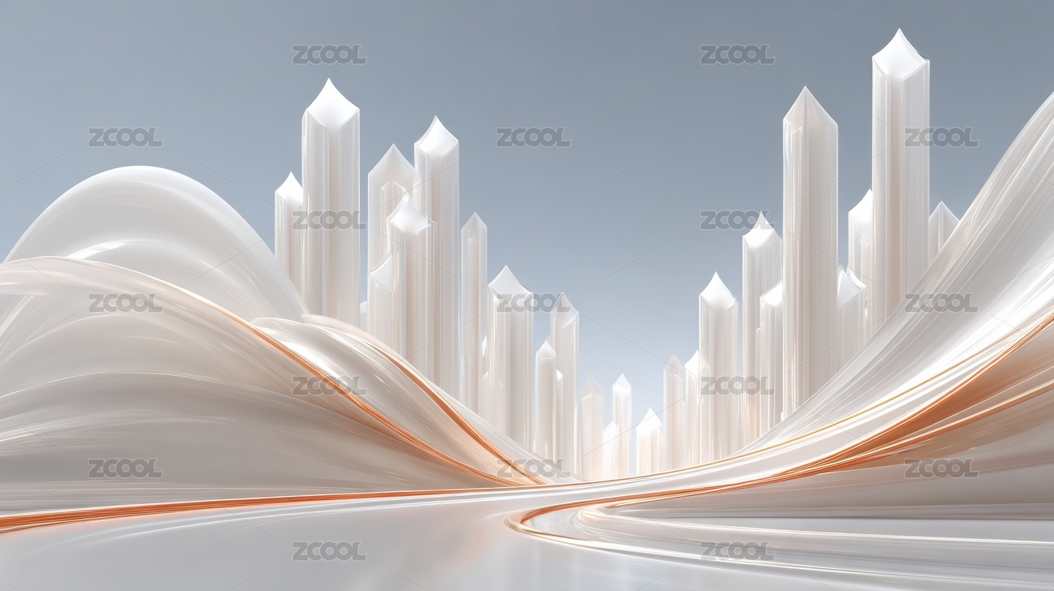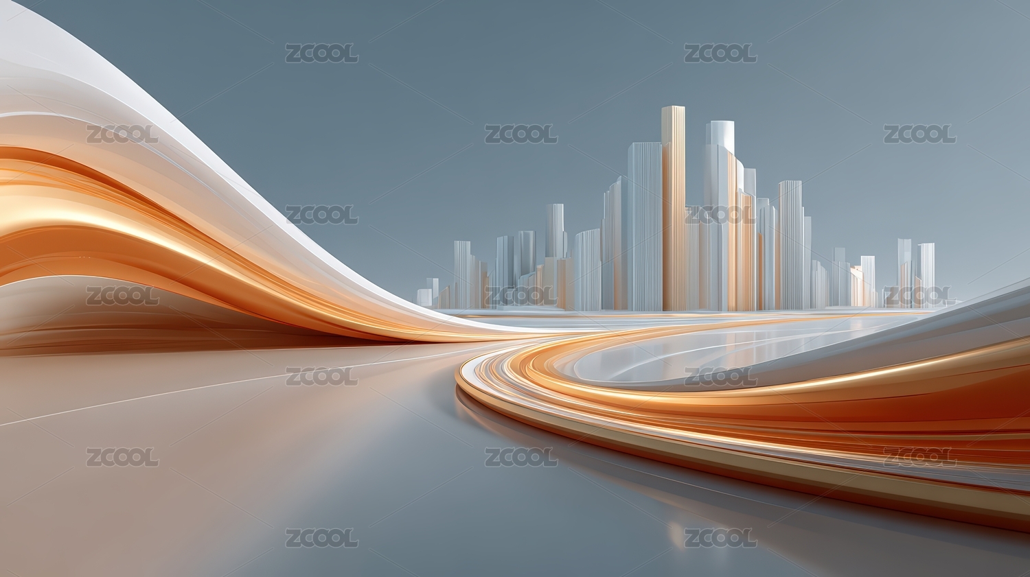 橙白相间的抽象波浪形建筑模糊的城市天际线