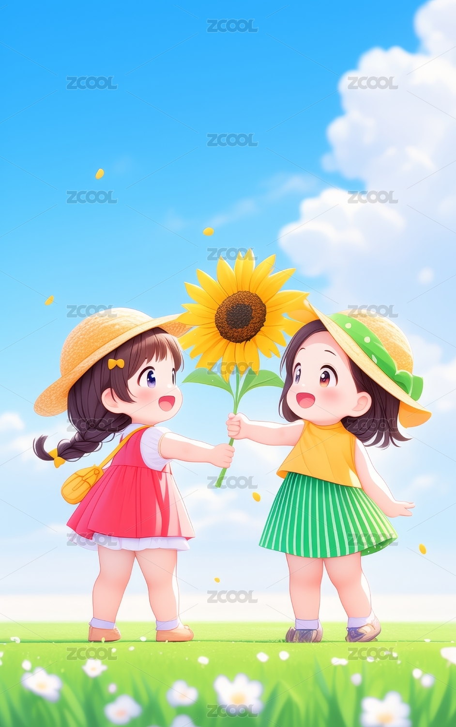 儿童,女孩,男孩,花草,蝴蝶,书本,铅笔,纸张,蓝天,白云