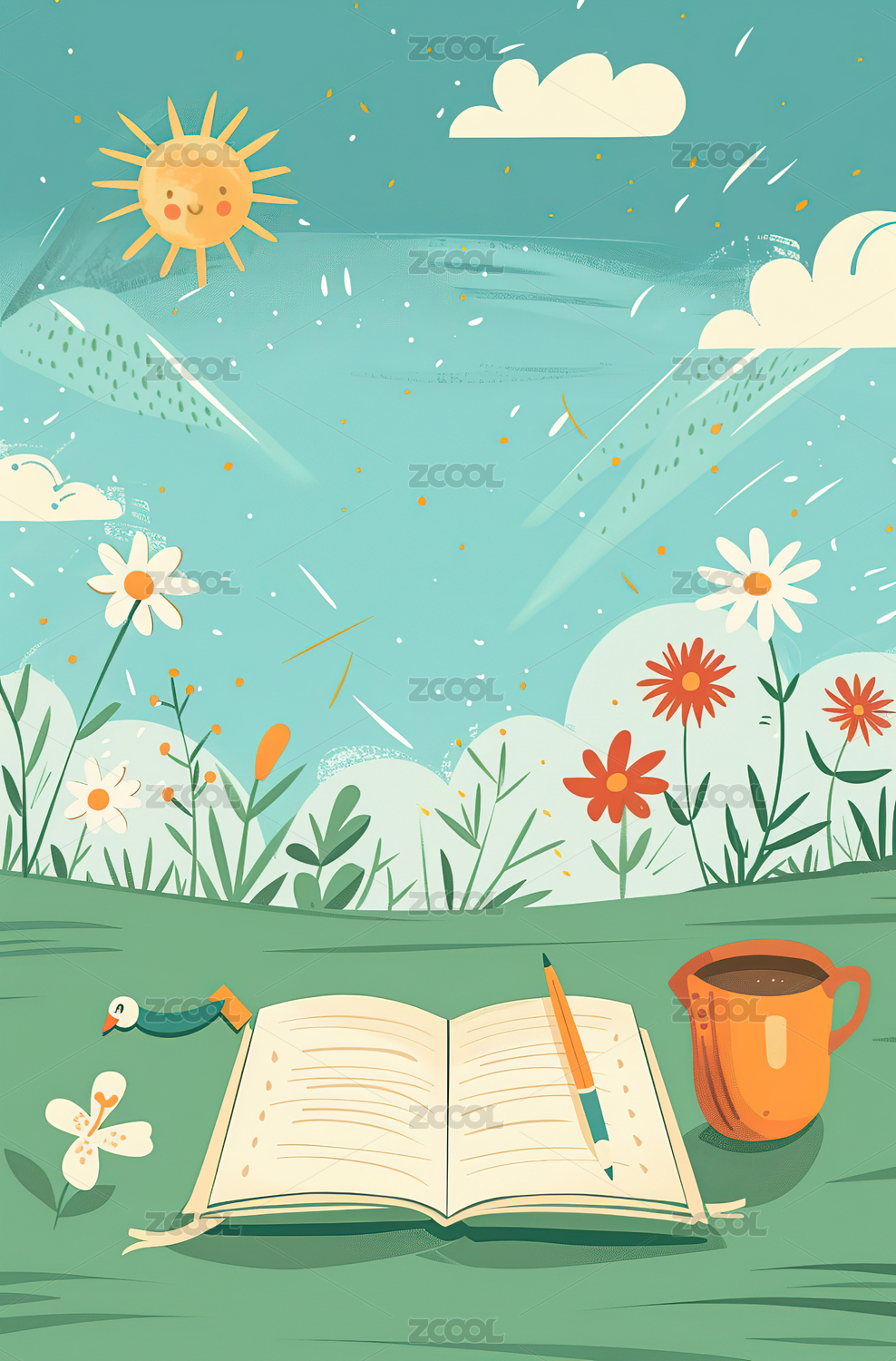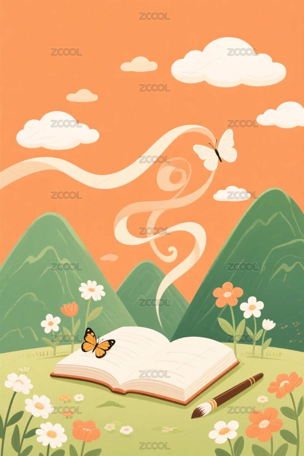 蝴蝶,书本,彩笔,花草,天空,插画,创意,自然,学习,模板
