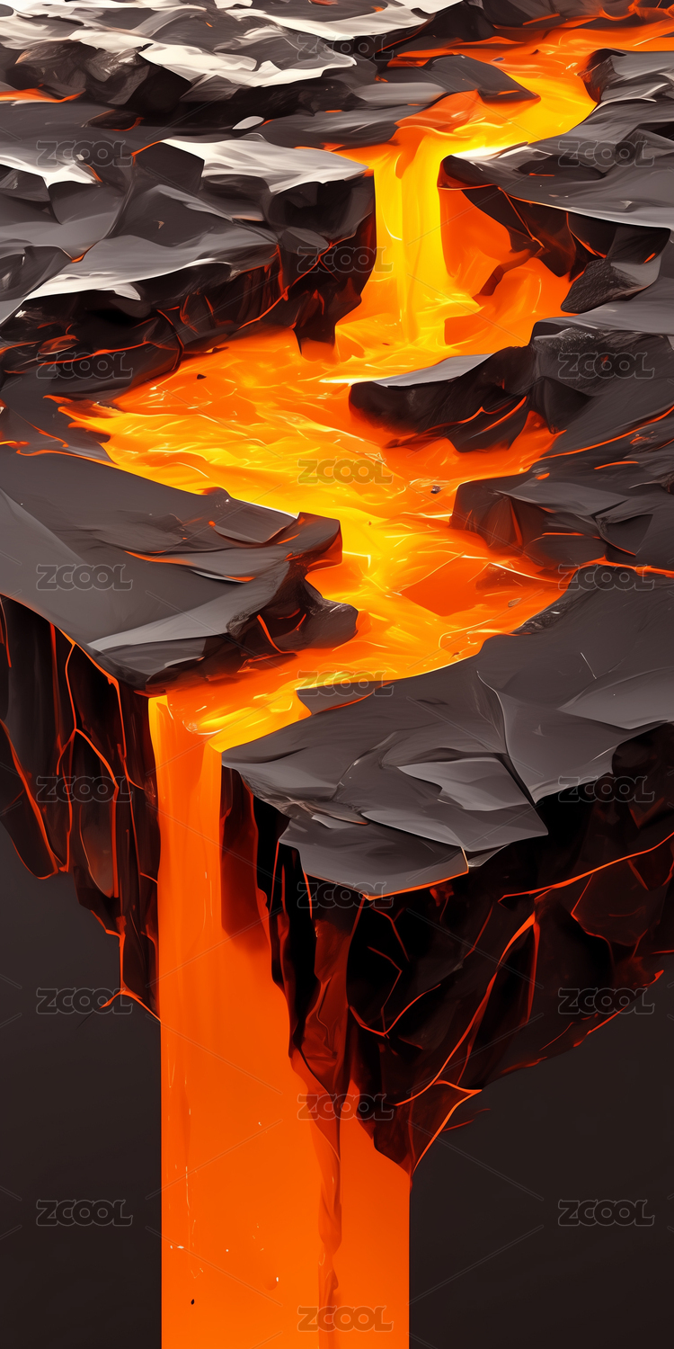 黑色悬崖山谷流淌火焰岩浆的立体模型沙盘画