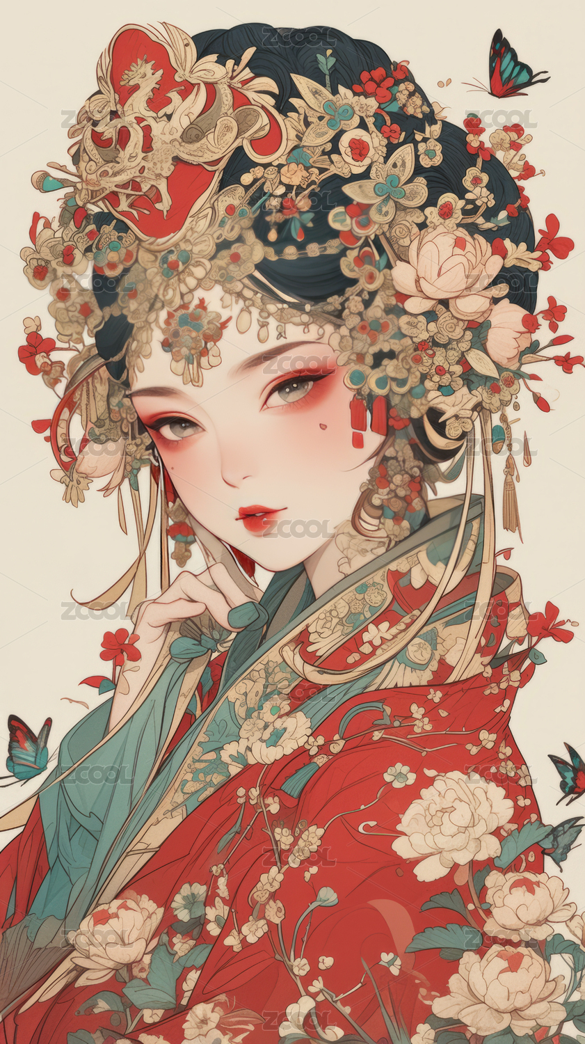 华丽裙装的女子,被花朵和蝴蝶环绕