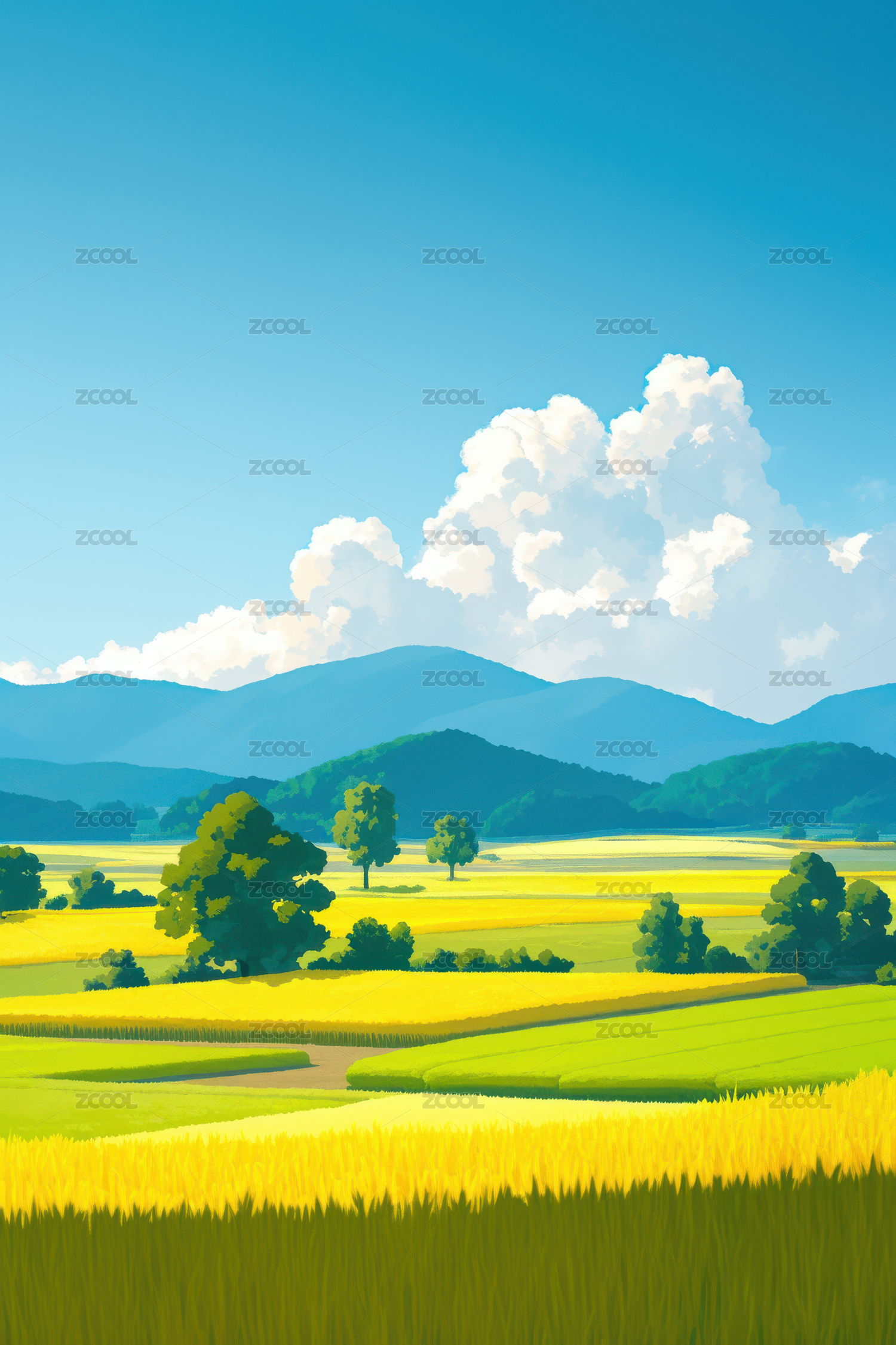 田园绿野山川风景插画