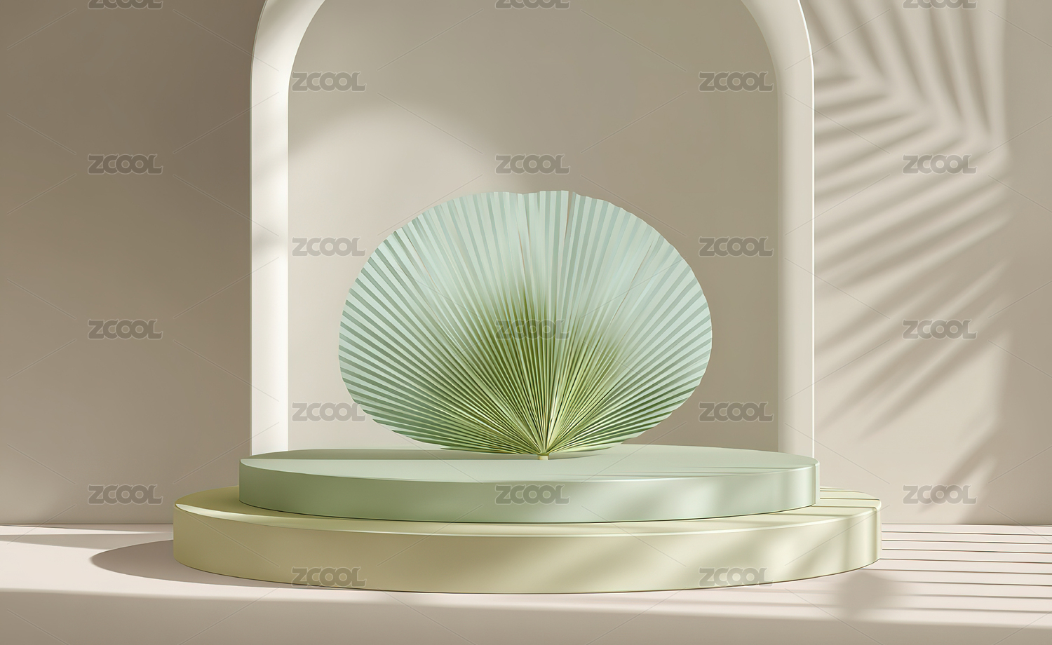 简约绿色背景下的弧形门洞与圆台