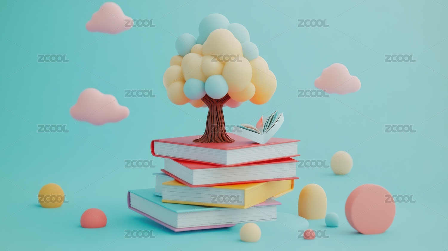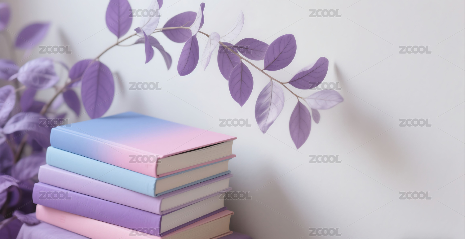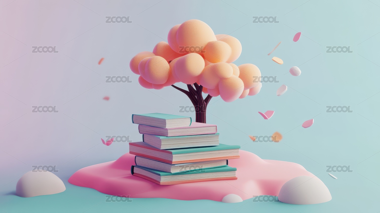 梦幻,书本,渐变,花瓣,樱花,树冠,粉蓝,书堆
