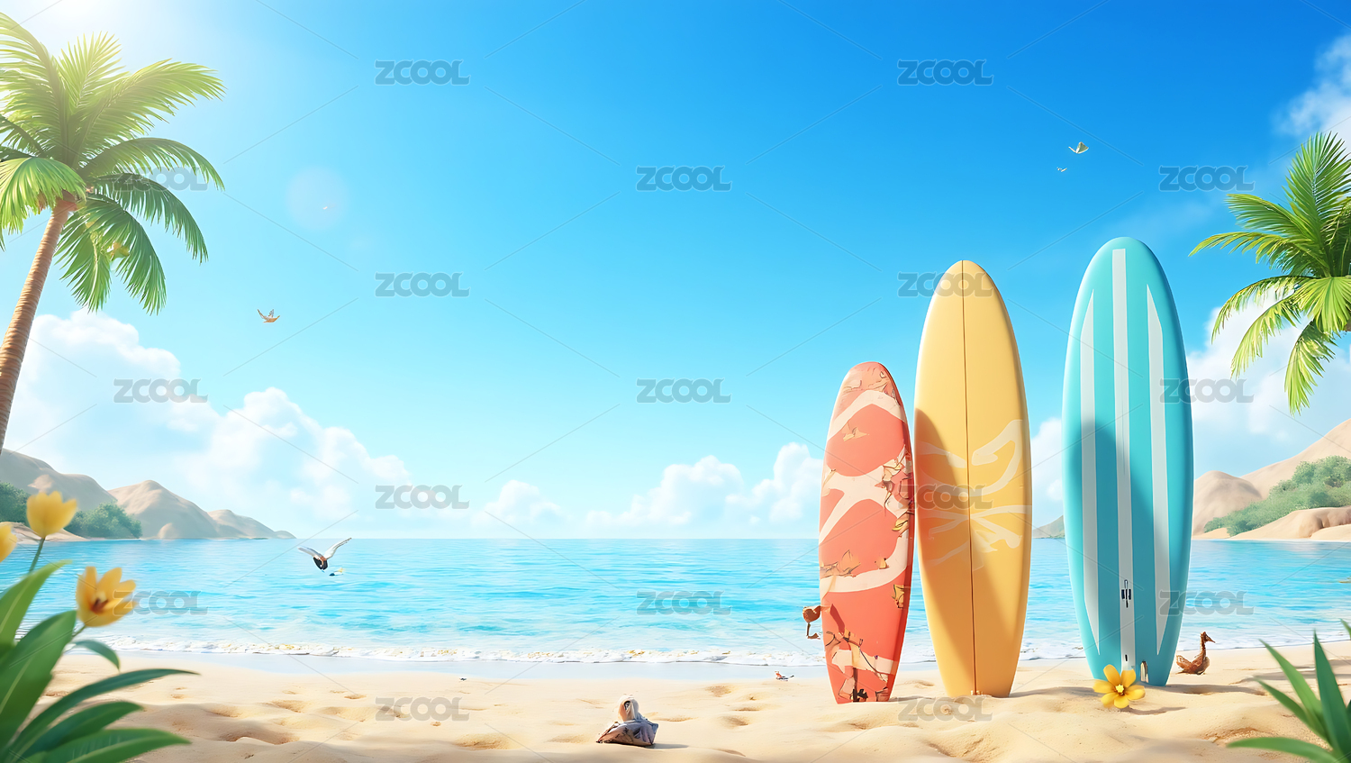 沙滩,冲浪板,椰树,阳光,海浪,海水,海岸,热带,沙粒,休闲