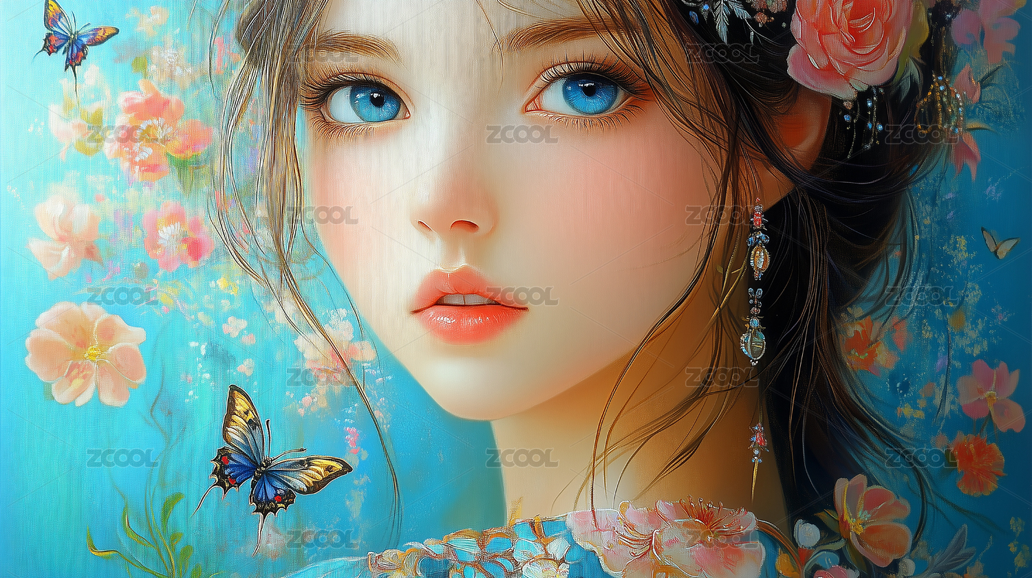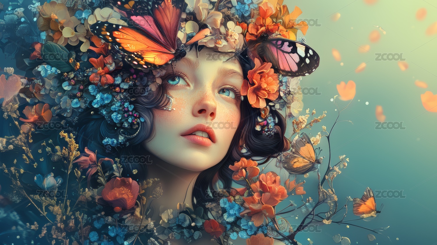 花蝶环绕的梦幻女孩数字艺术插画