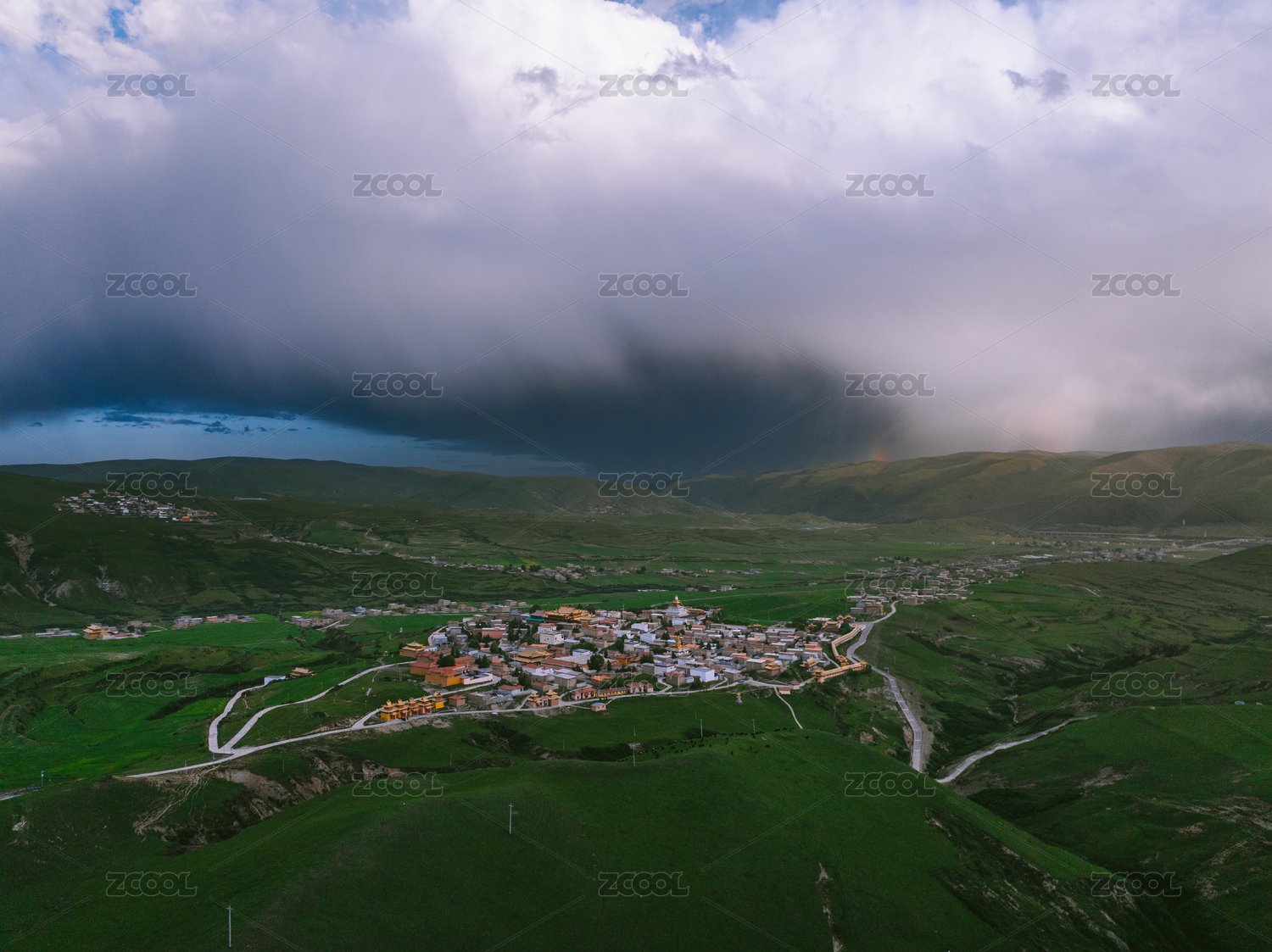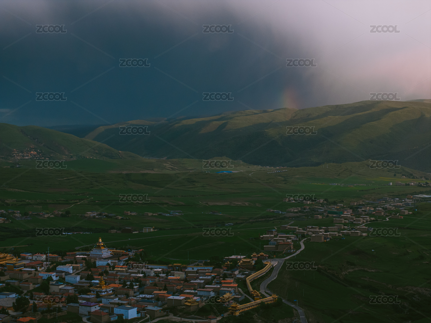中国四川阿坝州阿坝县朗依寺日落航拍