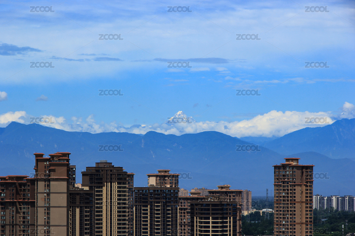 清晨日出时分的中国四川成都市区高楼和远方的日照雪山