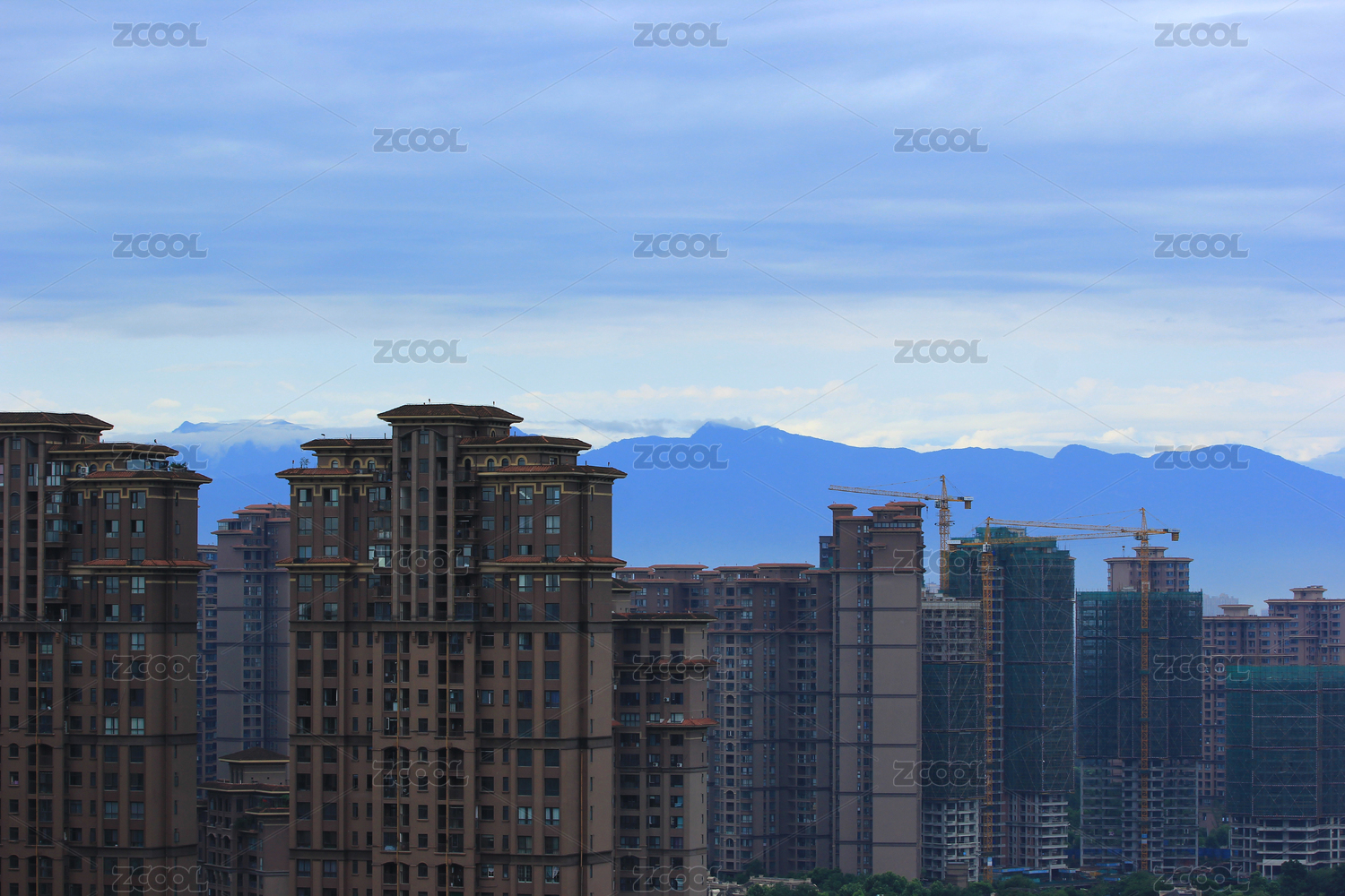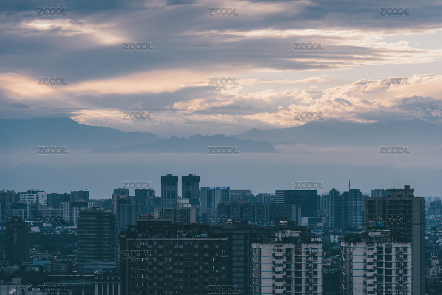 黄昏时分的城市楼房与远处层叠的山峰云海