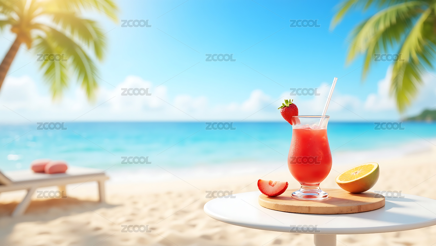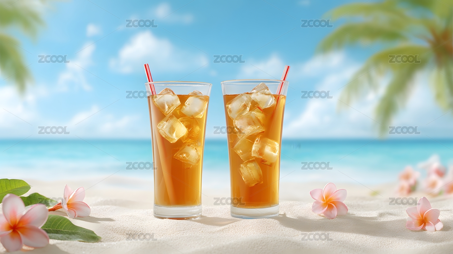 饮品,冰块,柠檬,吸管,椰树,海滩,夏日,冷饮,玻璃杯,清凉