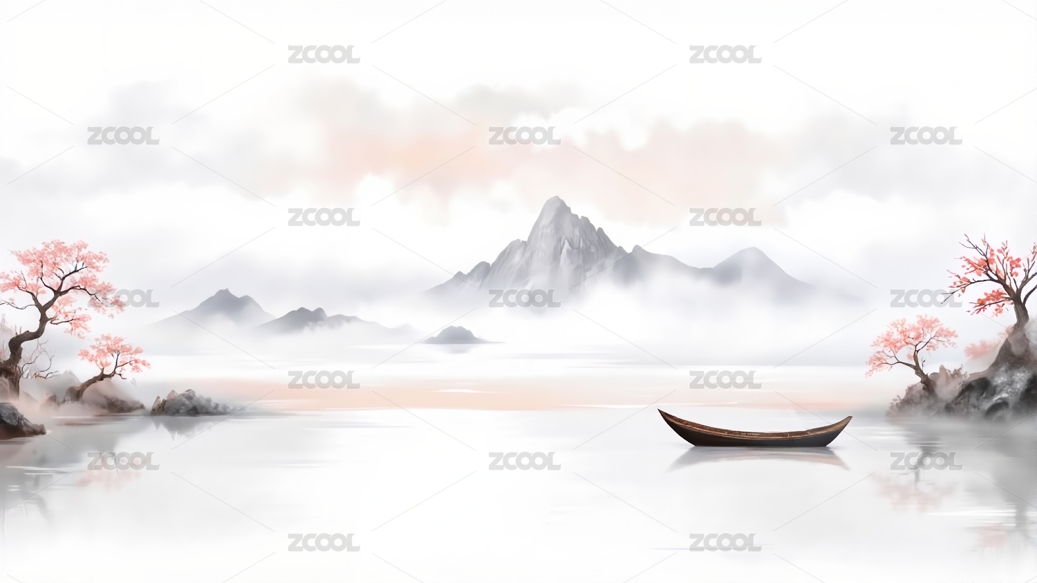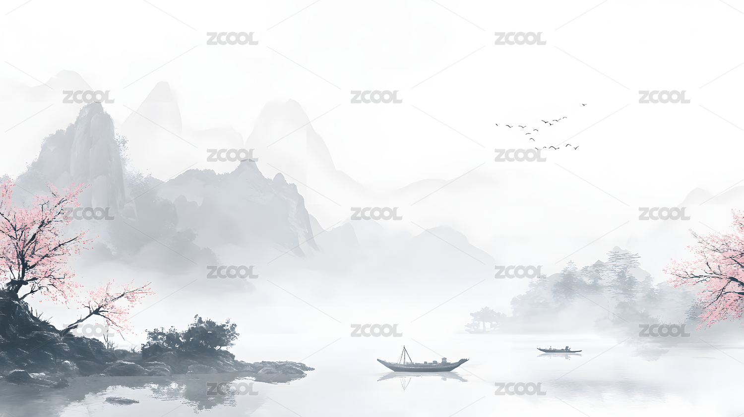 中国风水墨山水画湖面倒影云雾仙境
