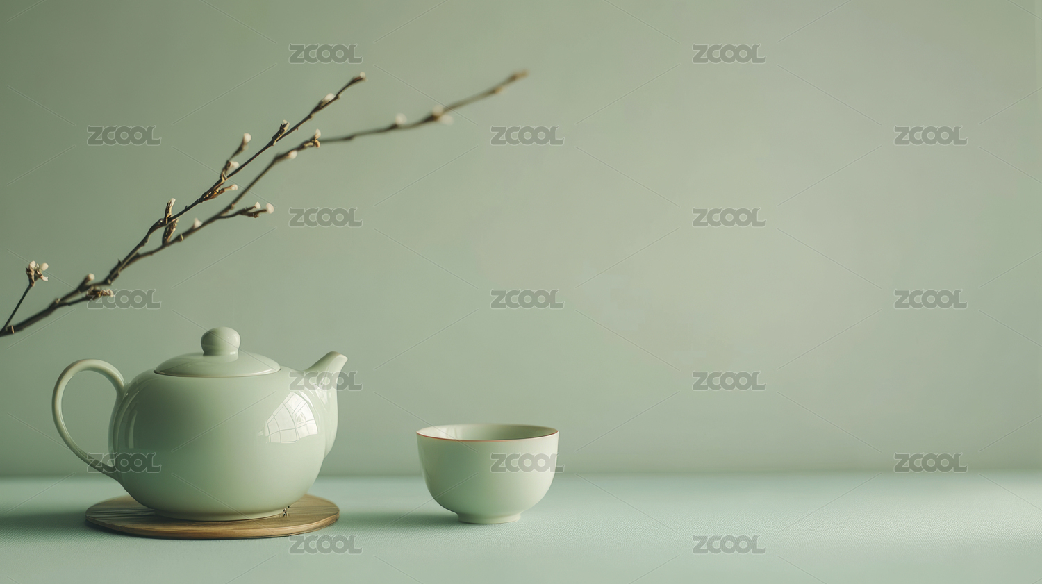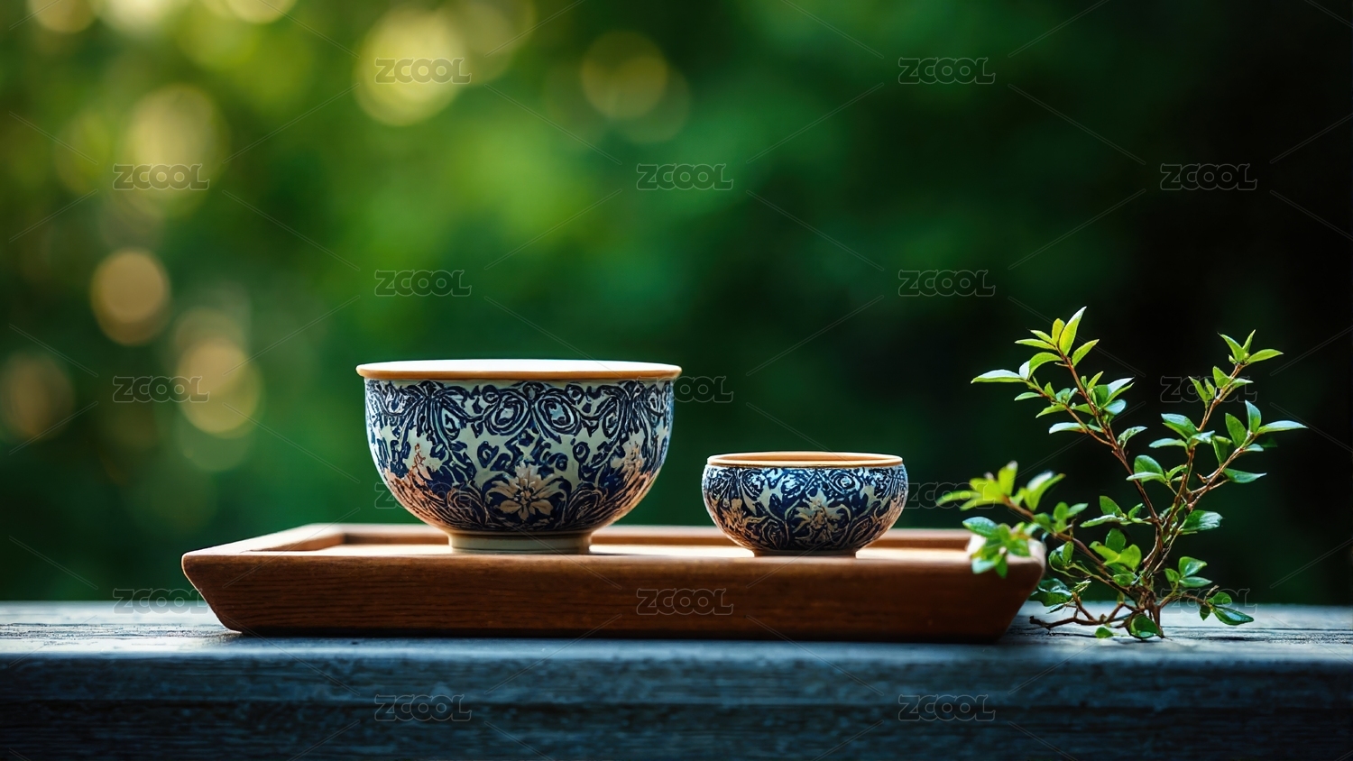 茶壶,茶杯,绿植,托盘,陶瓷,蓝色,白色,窗户,阳光,茶具